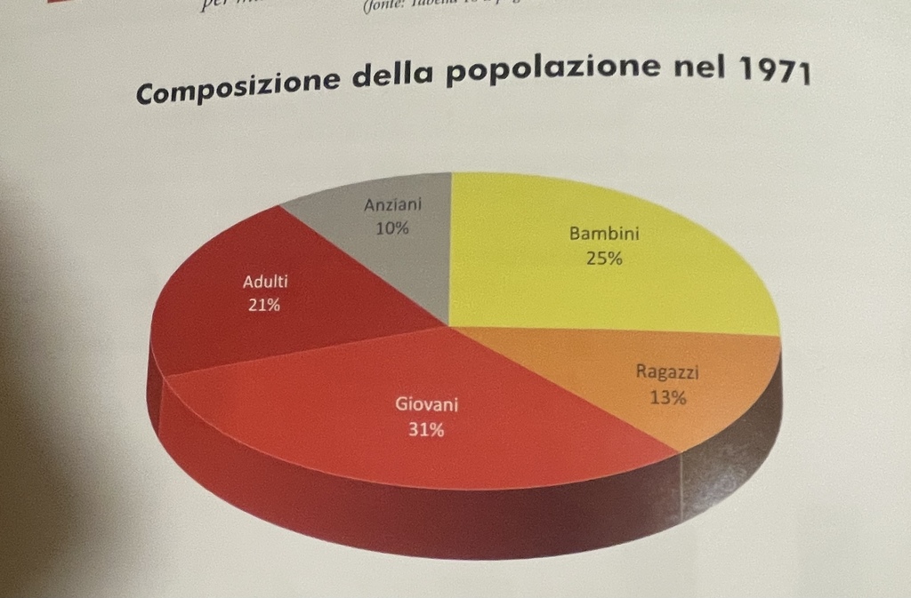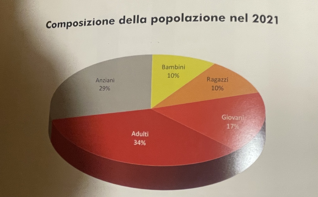 Cinquant'anni fa 1 persona su 4 aveva meno di 15 anni, Oggi i giovanissimi sono solo 1 ogni 11 residenti. Cinquant'anni fa 1 persona su 11 aveva 65 anni o più, mentre oggi gli anziani sono giunti a essere 1 persona su 3