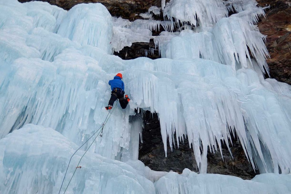 Our ice climbing course provides the theoretical knowledge and technical skills needed to safely climb on icefalls and is devised to gradually improve the participants' skills, to make them able to progress autonomously on itineraries of average difficulty.
