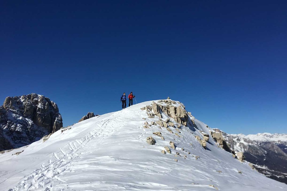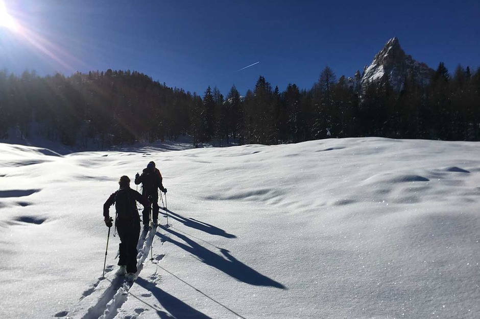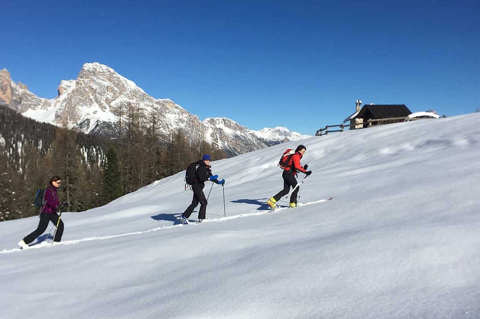 The itinerary of the backcountry excursion in Cortina to the Rocchette progresses towards the Hunter's Hut on Col Degiarenei, gently climbing up to the foot of the Rocchette rocks.