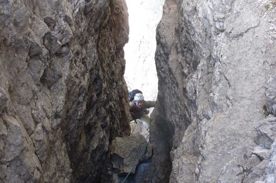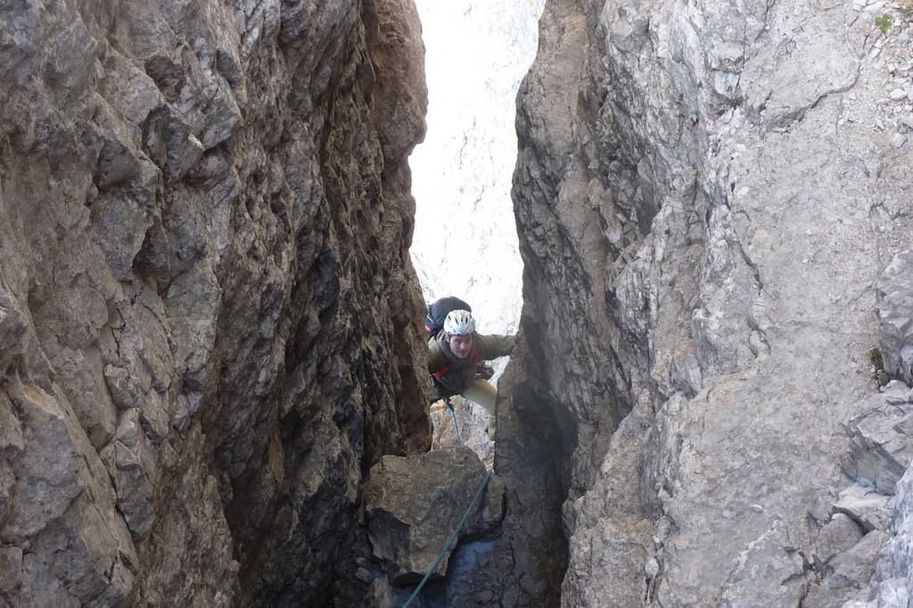 The itinerary is easy to follow, the route is well equipped with inox bolts at the belay points. The key pitch is a wide crack, that can be circumvented on the left side. Once you get on the ledge, cross it towards South-west until you see the cairns that show the path to the summit.