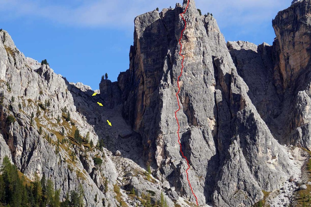 Transfer pitch towards the vertical slabs of the pinnacle.