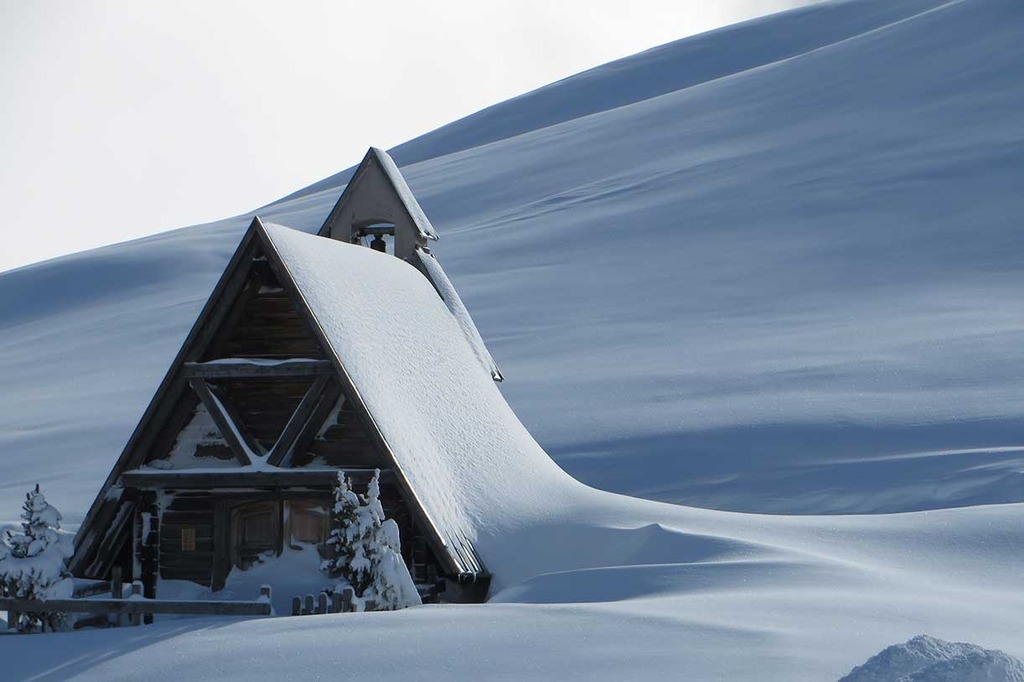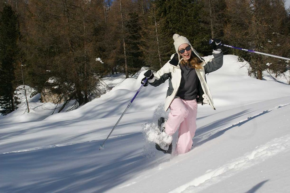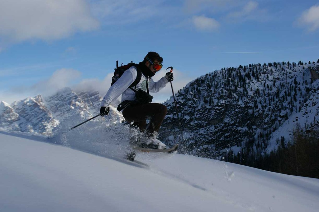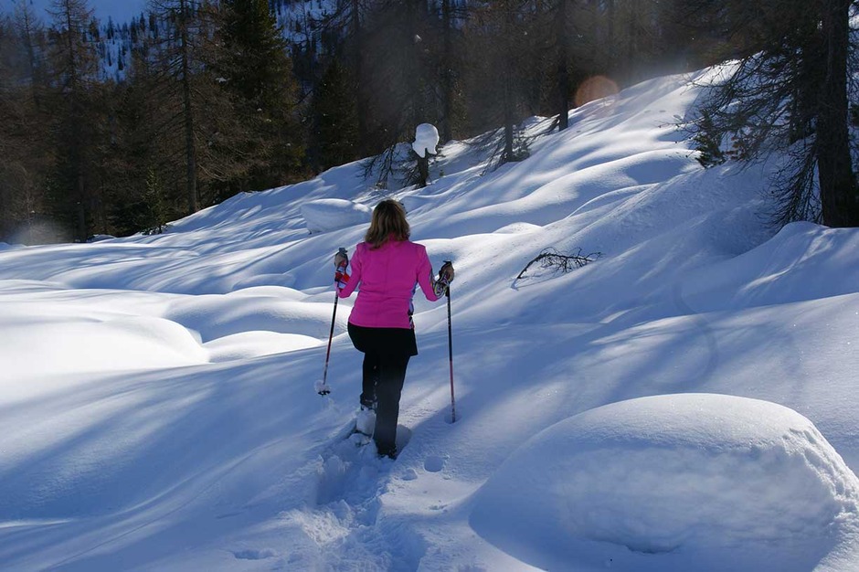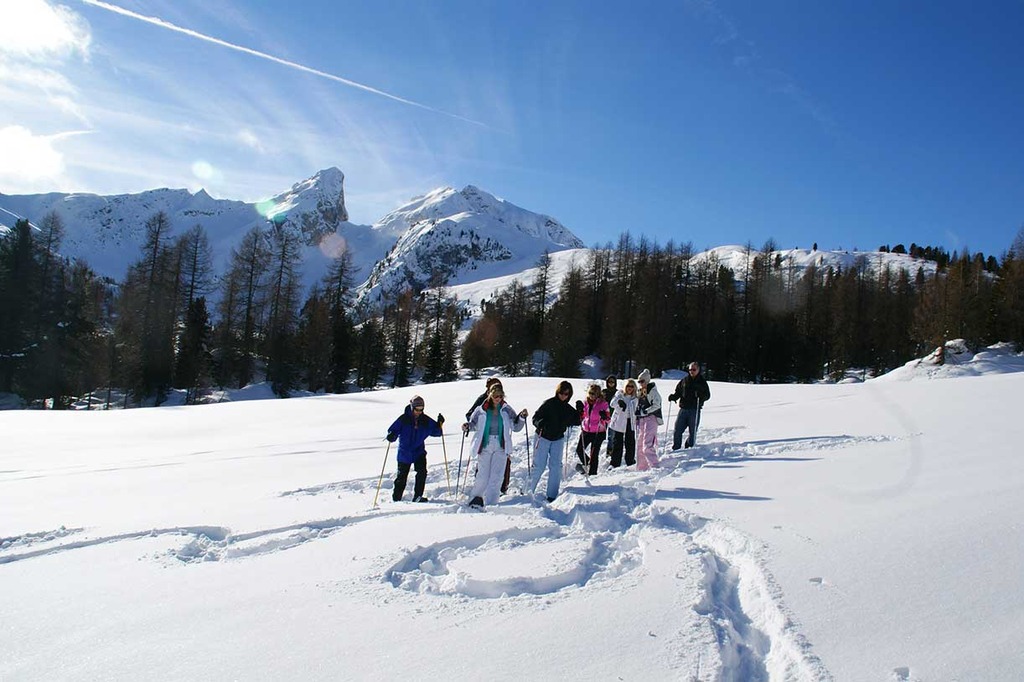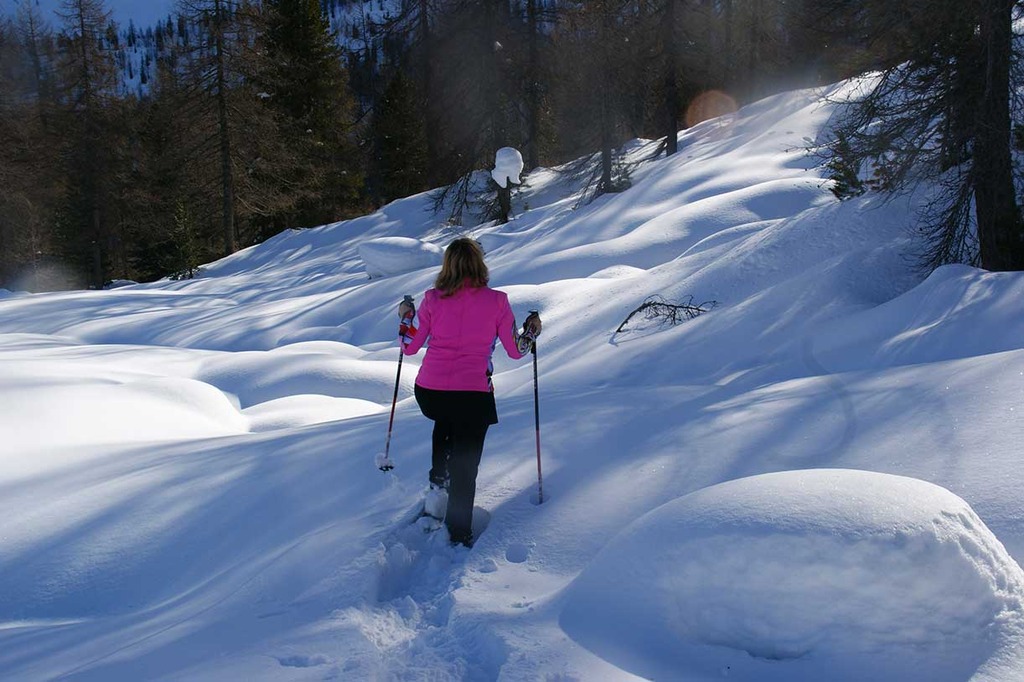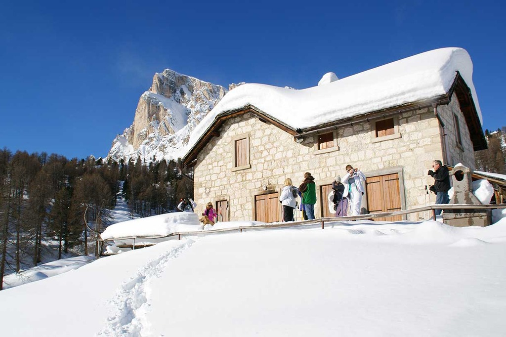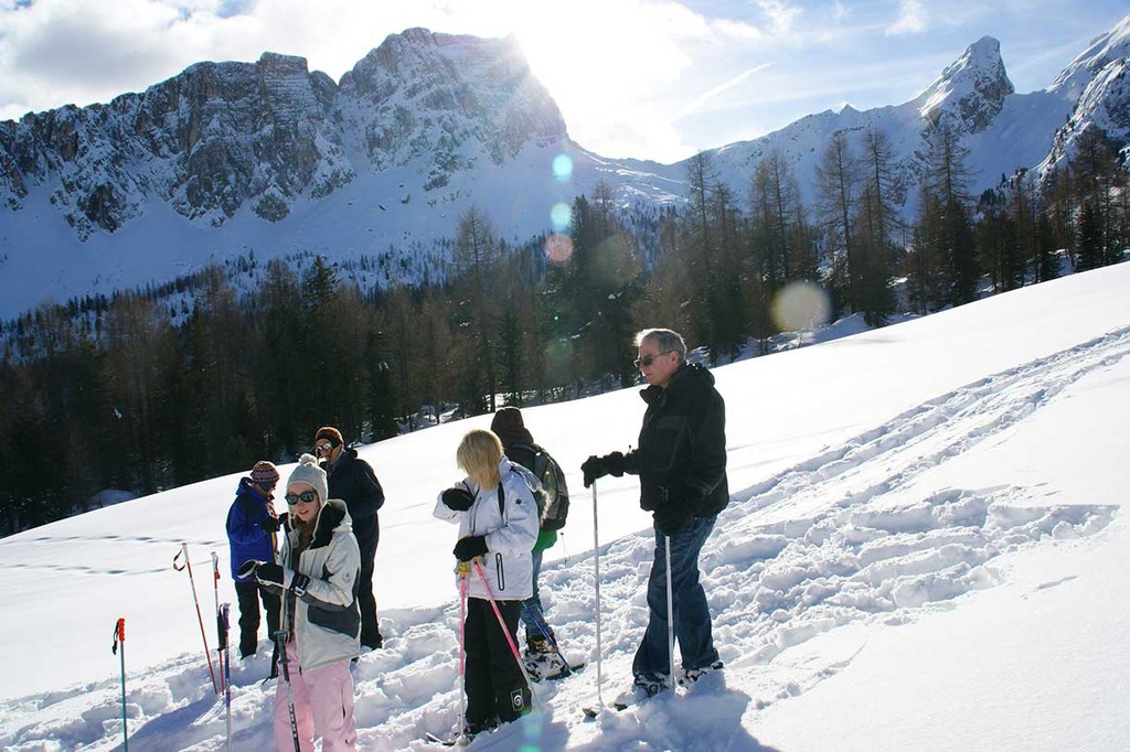 From the lodge, we proceed into the woods on snowshoes until we take a glimpse at the wall that we are going to follow, up to the base of the great rock of the Becco Muraglia. Then the trek continues along a wide ridge, beneath the walls of the Monte Ra Gusella.
