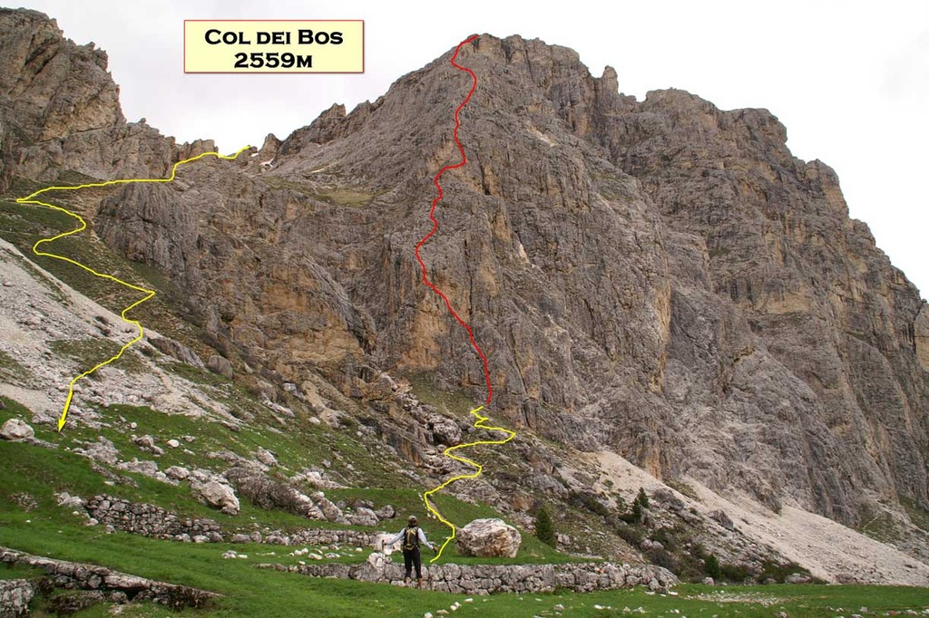 This is a recently built via ferrata, perfectly equipped with a new steel cable and pitons close to one another and shielded by plastic wedges. It stretches out along the smooth western edge of Col dei Bos, with an elevation gain of approximately 500 metres.