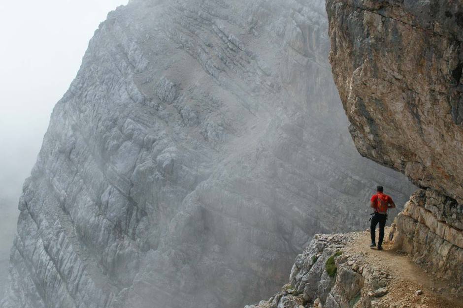 The via ferrata is equipped with steel cables and has plenty of natural handholds. The most peculiar part of the itinerary is the natural bridge that links Tofana di Mezzo and Tofana Terza. The elevation gain is approximately 200 metres.