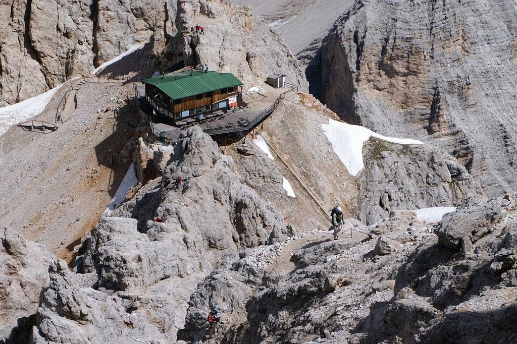 The starting point of the Via Ferrata Marino Bianchi is the terrace of the hut Rifugio Lorenzi (3000 metres a.s.l.), from where the ferrata steel cable begins and you will have to face the technically challenging first pitch.