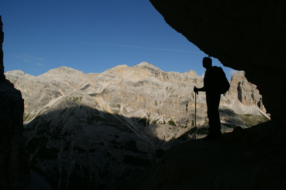 Following the signs towards the Via Ferrata Tomaselli, proceed along the long west face of the Grande Lagazuoi peak on an old military trail, until you reach the large terrace of Fanis.