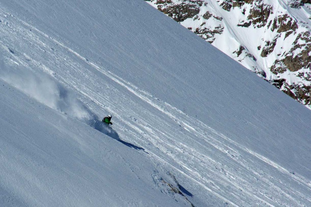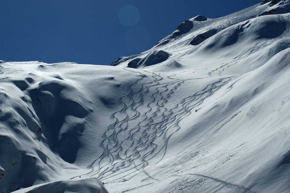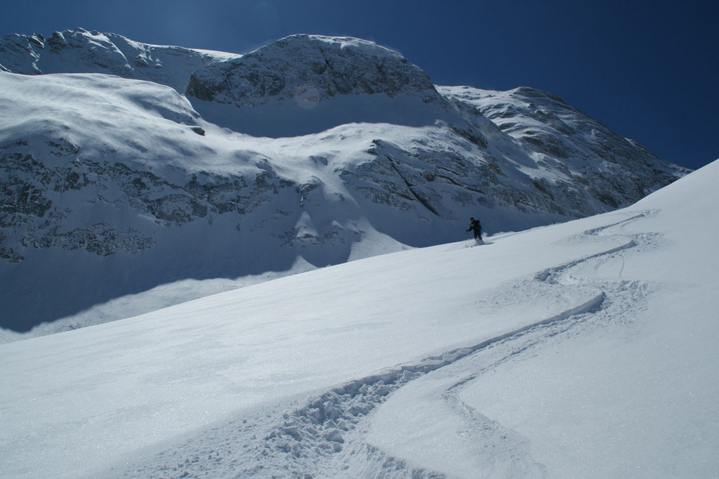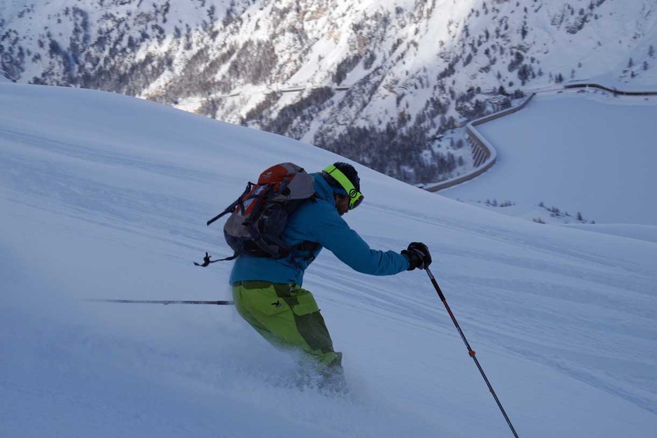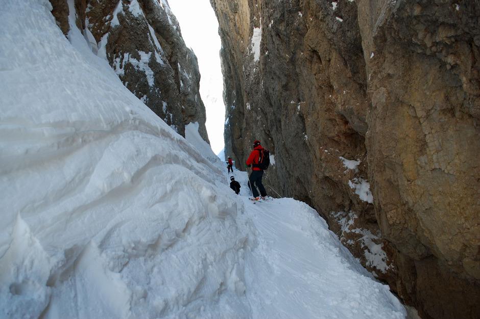 The excursion will end with a last off-piste skiing slope, reachable with a 10 minutes walk: a narrow couloir that ends up in a wide but steep couloir.