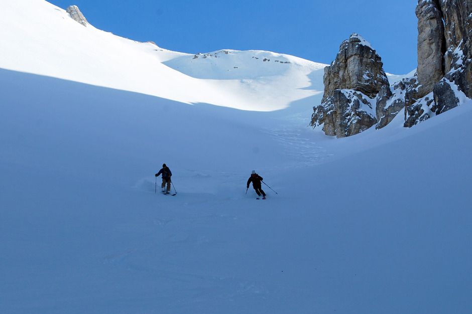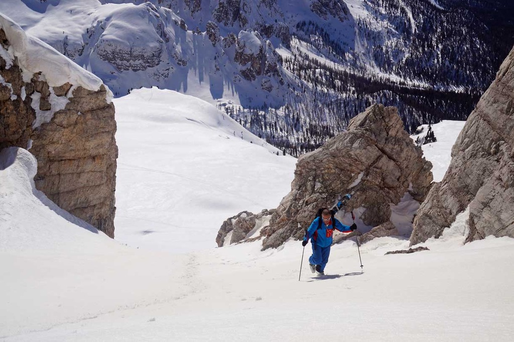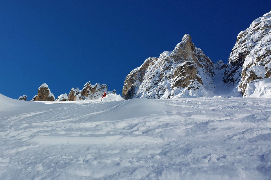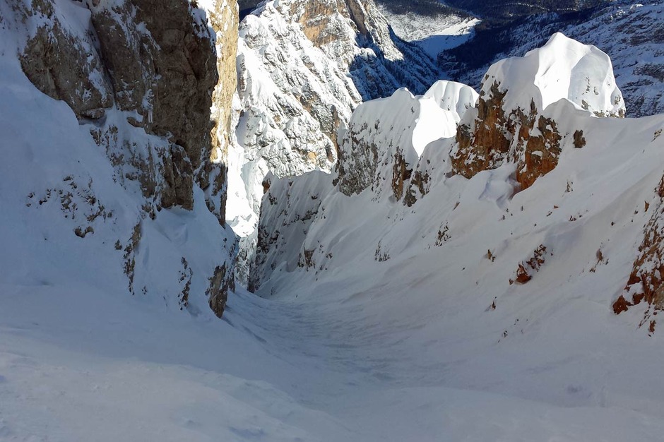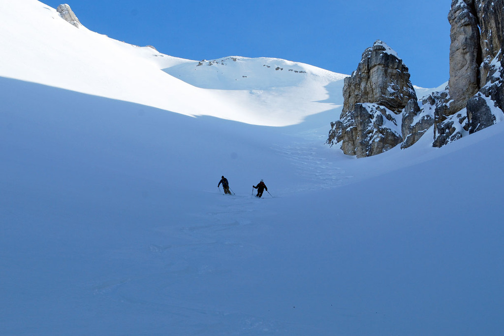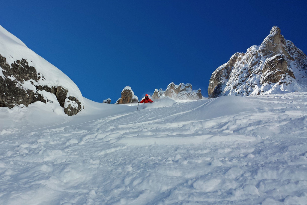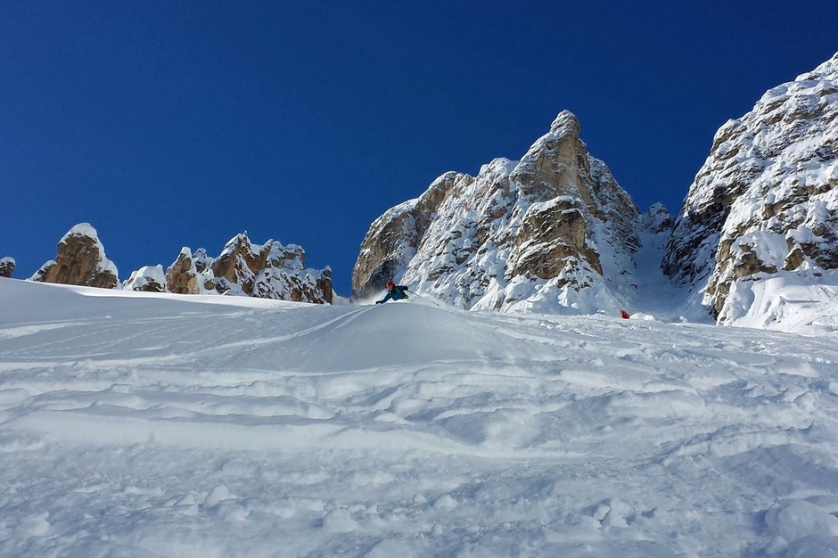 The first off-piste skiing section begins there: you will ski along the Creste Bianche (white peaks) or one of the rills known as Canalini di Val Fonda, according to the decision of the Dolomiti SkiRock Mountain Guide, who will evaluate the snow conditions and decide consequently. After an amazing descent on the 1500 metre long slope, you will reach the paved road that links Cortina to the Puster Valley.