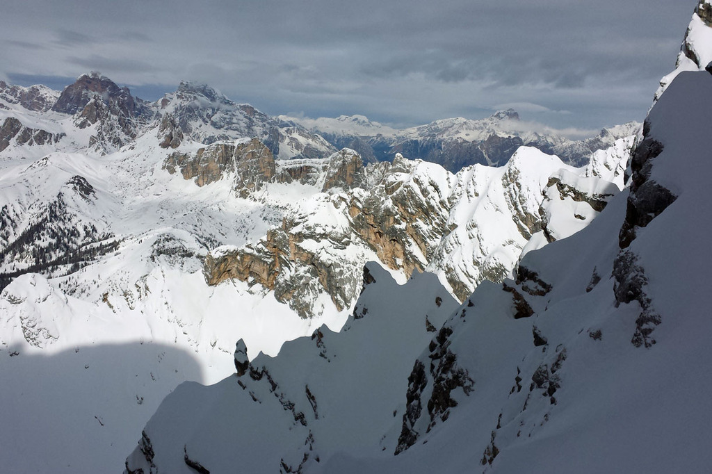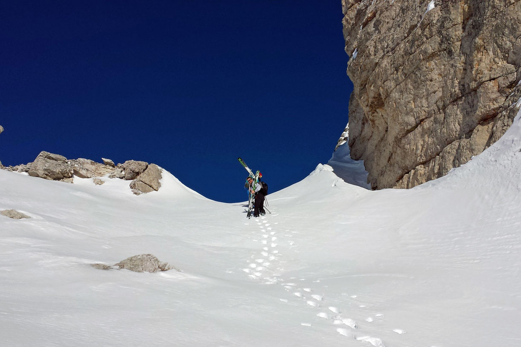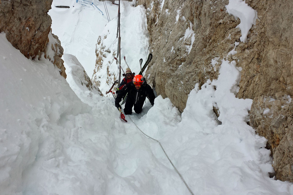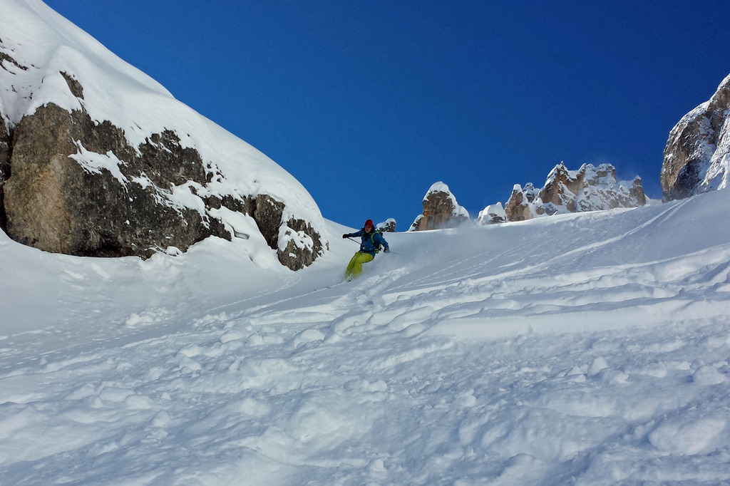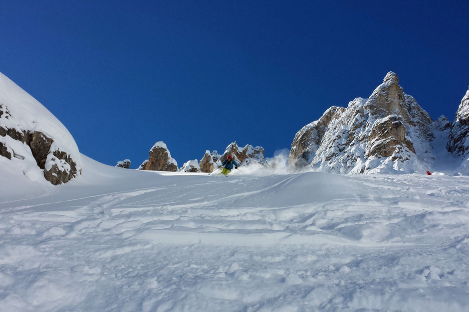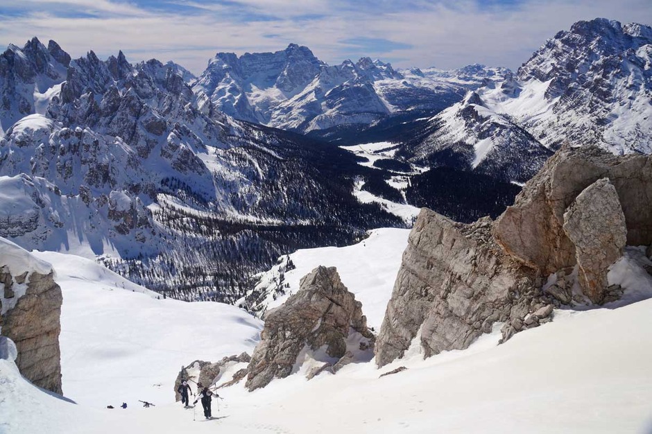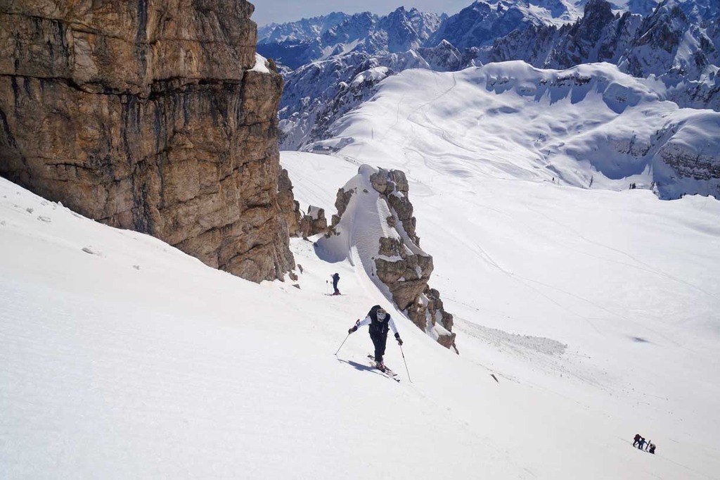 The first off-piste skiing section begins there: you will ski along the Creste Bianche (white peaks) or one of the rills known as Canalini di Val Fonda, according to the decision of the Dolomiti SkiRock Mountain Guide, who will evaluate the snow conditions and decide consequently. After an amazing descent on the 1500 metre long slope, you will reach the paved road that links Cortina to the Puster Valley.
