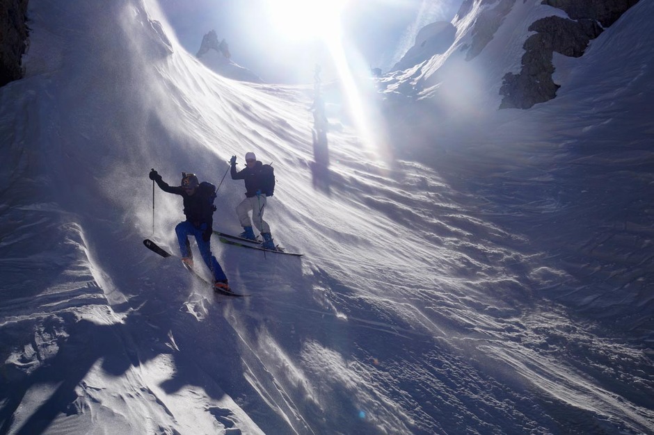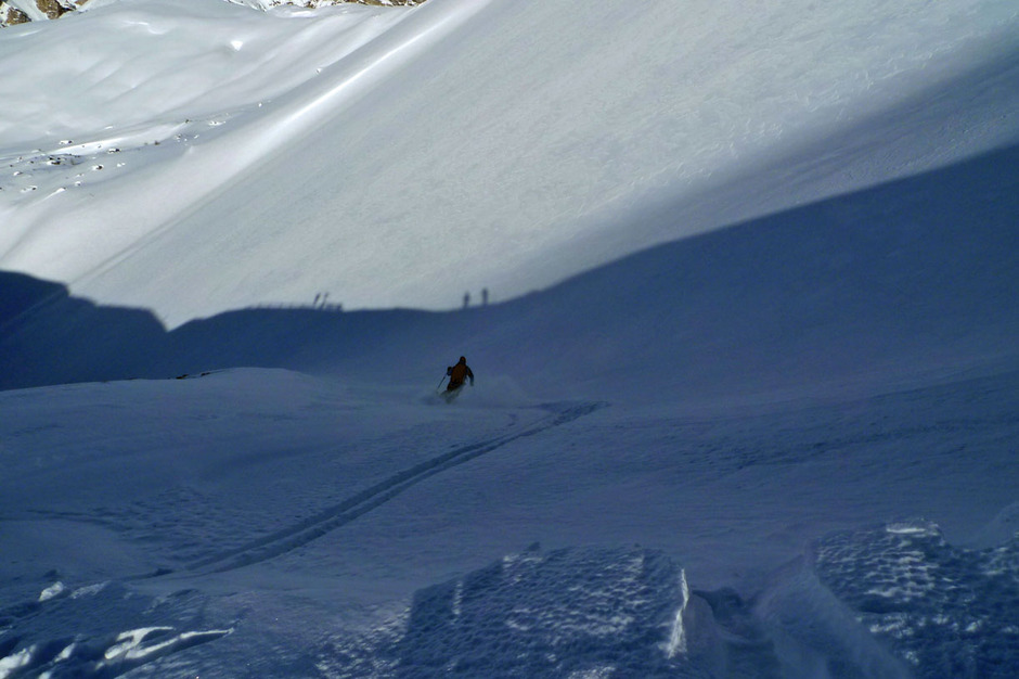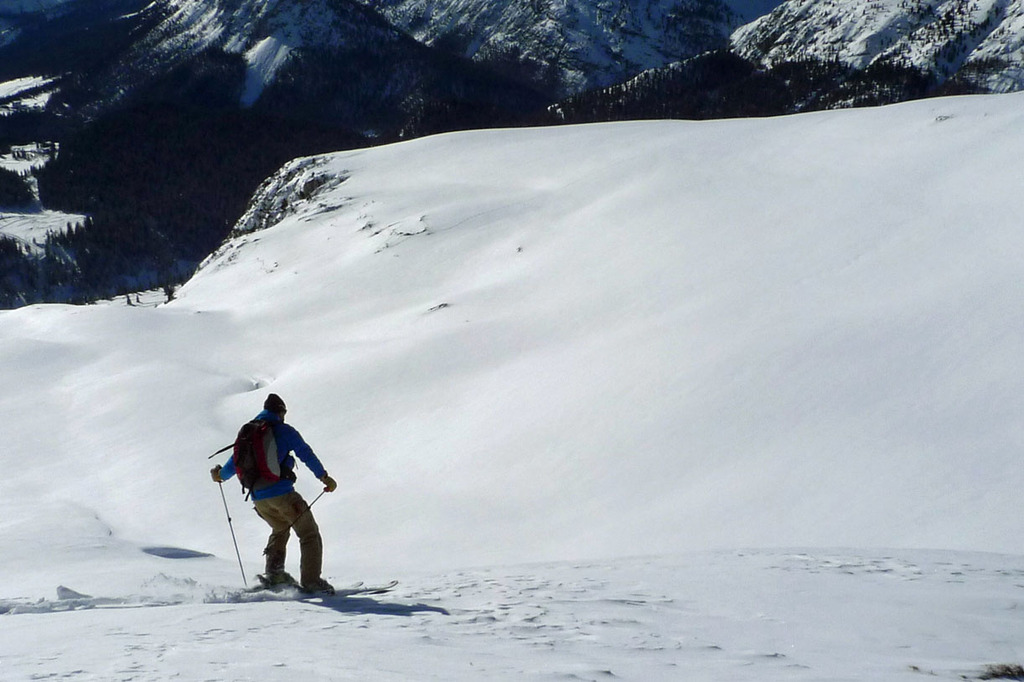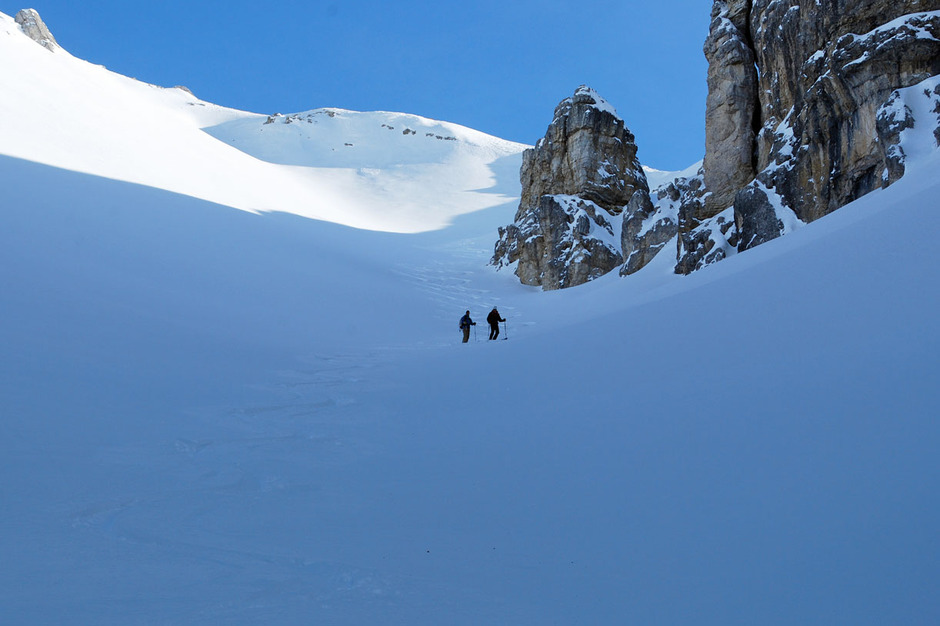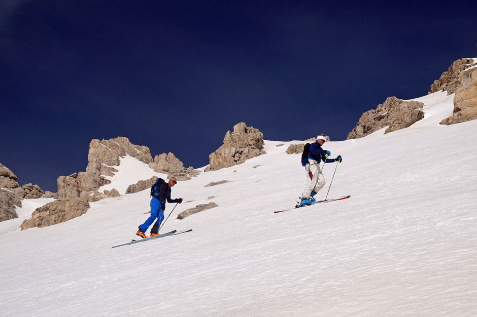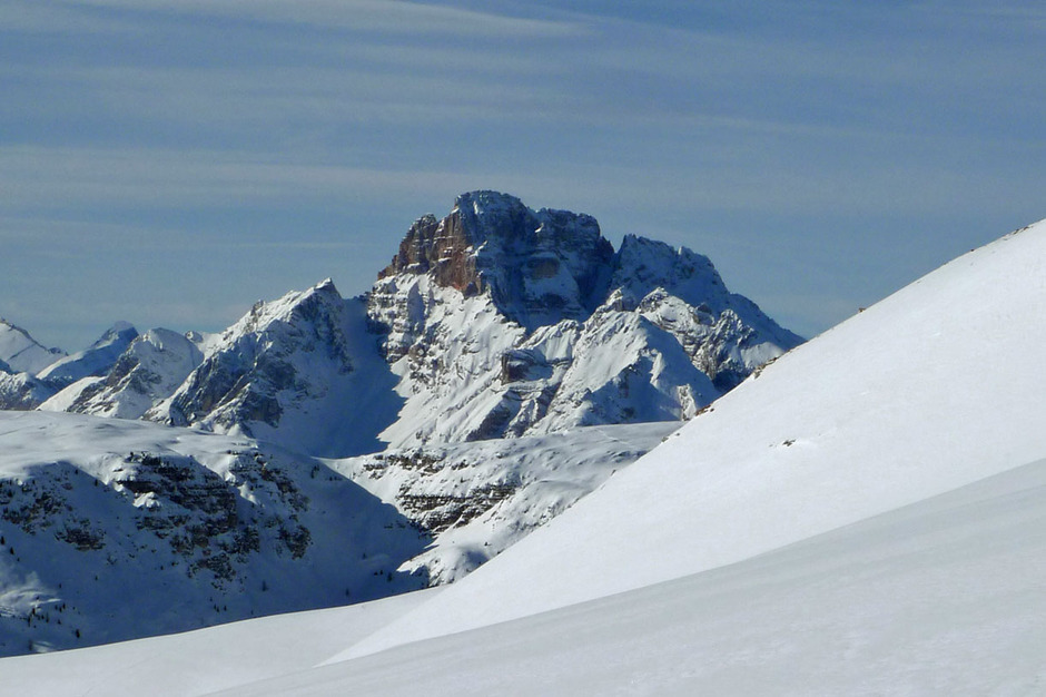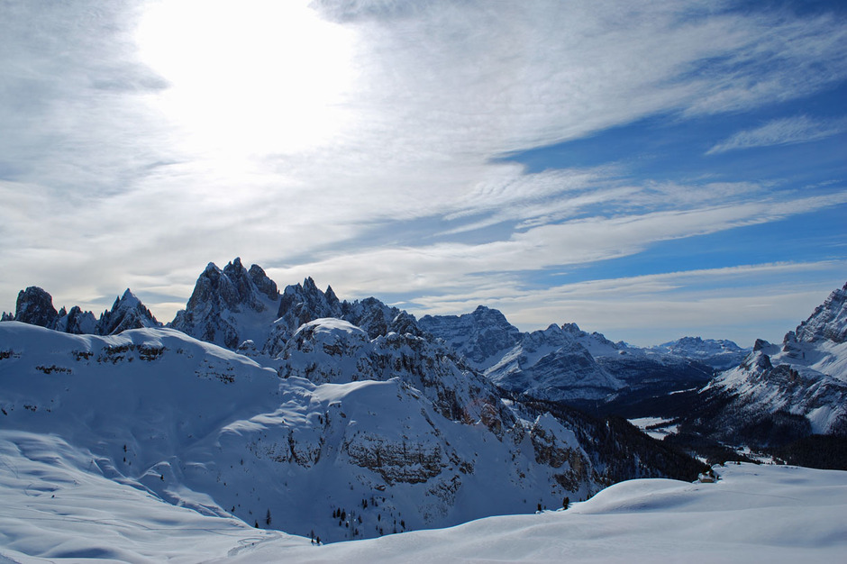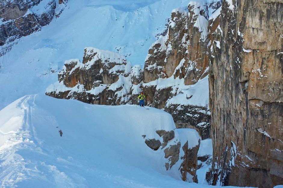 The first off-piste skiing section begins there: you will ski along the Creste Bianche (white peaks) or one of the rills known as Canalini di Val Fonda, according to the decision of the Dolomiti SkiRock Mountain Guide, who will evaluate the snow conditions and decide consequently. After an amazing descent on the 1500 metre long slope, you will reach the paved road that links Cortina to the Puster Valley.