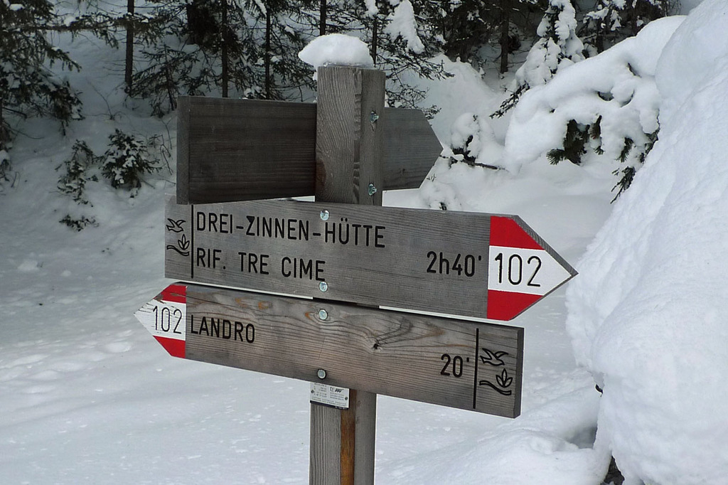 Then, put on the ski skins and start hiking towards the mountain pass that lies between the peaks Torre Lavaredo and Sasso di Landro (2500 metres a.s.l.), reachable in 1 hour walk.