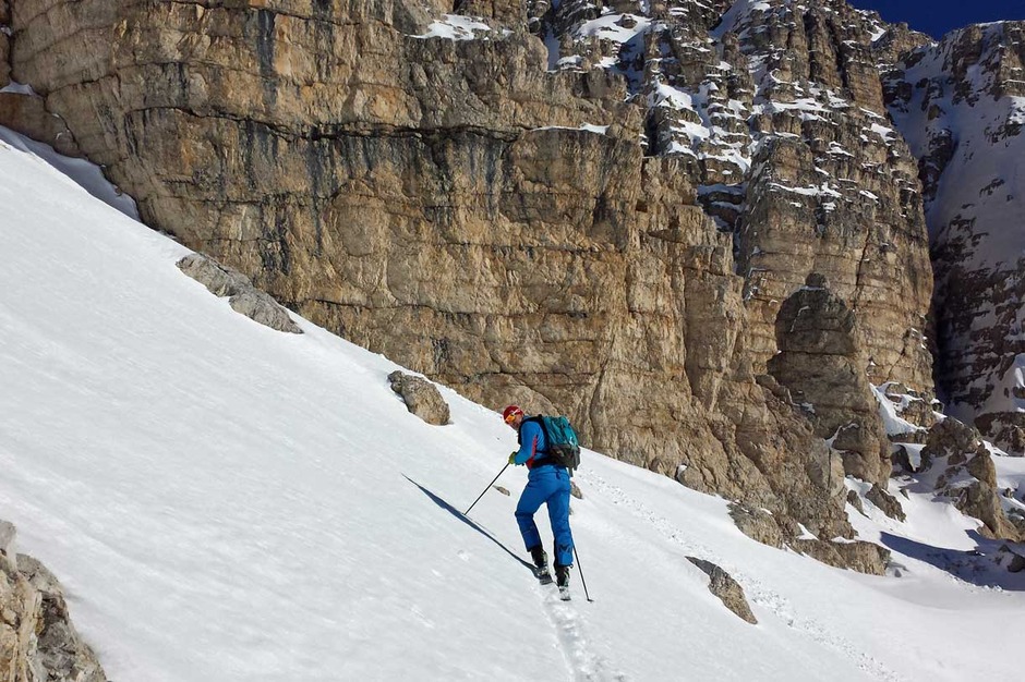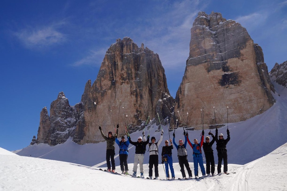 From there, start the off-piste skiing descent beneath the imposing north face of Tre Cime di Lavaredo.
