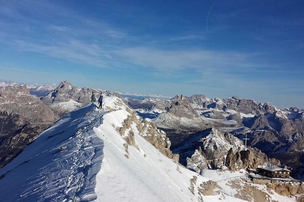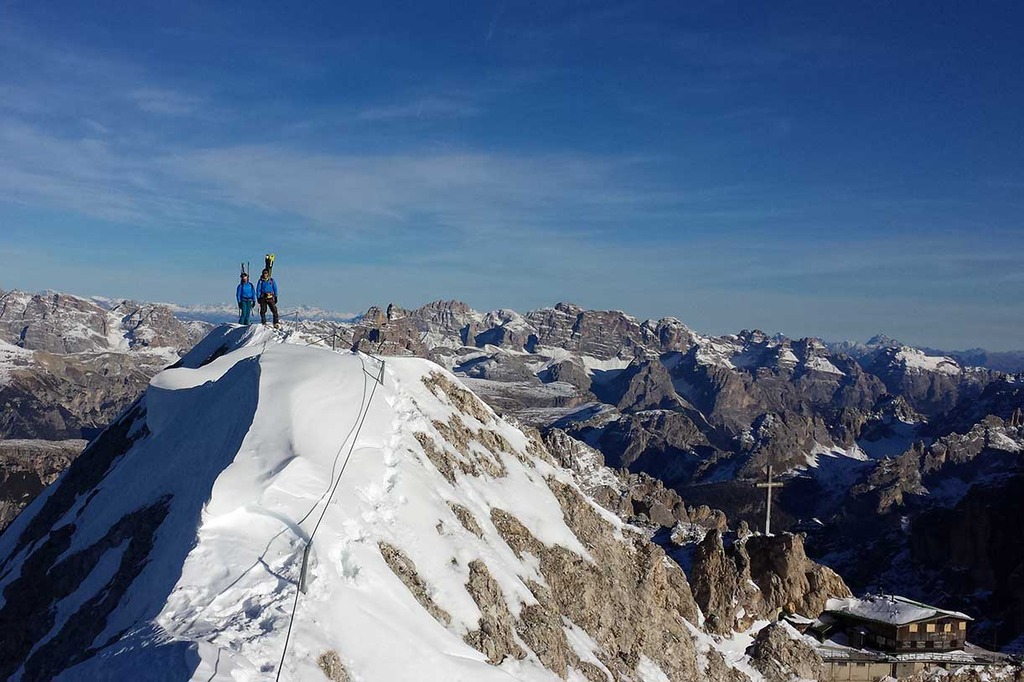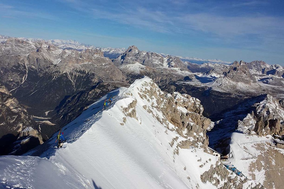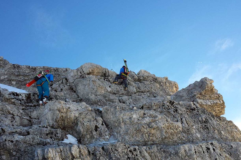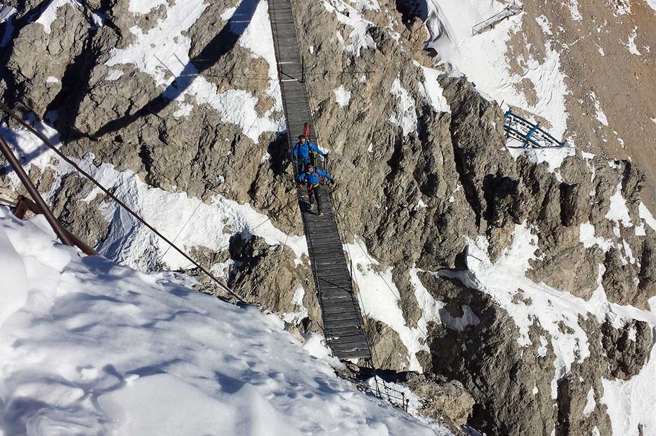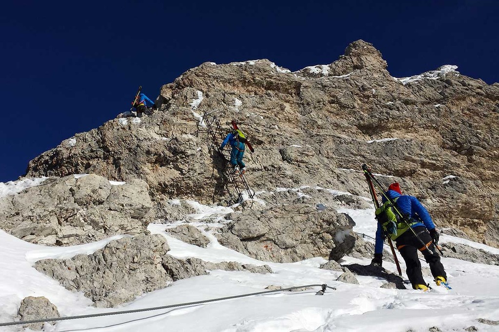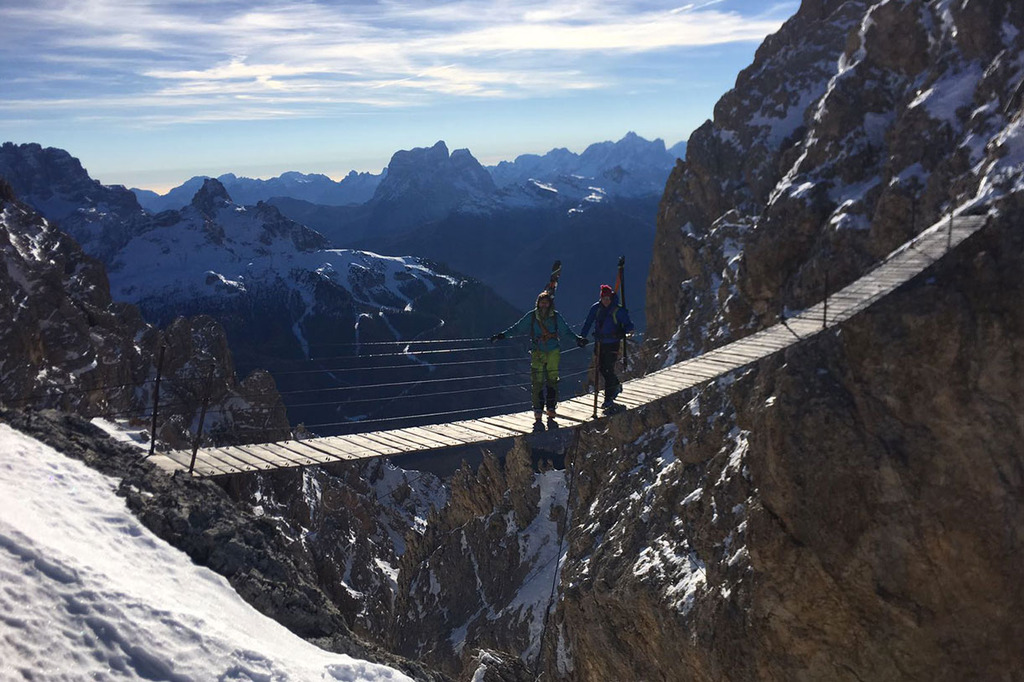 Wearing crampons, we start climbing the rocky ridge along the Via Ferrata Ivano Dibona, passing over rocky, snowy and icy sections, vertical ladders and the famous breathtaking suspended bridge at an altitude of 3,000 meters.