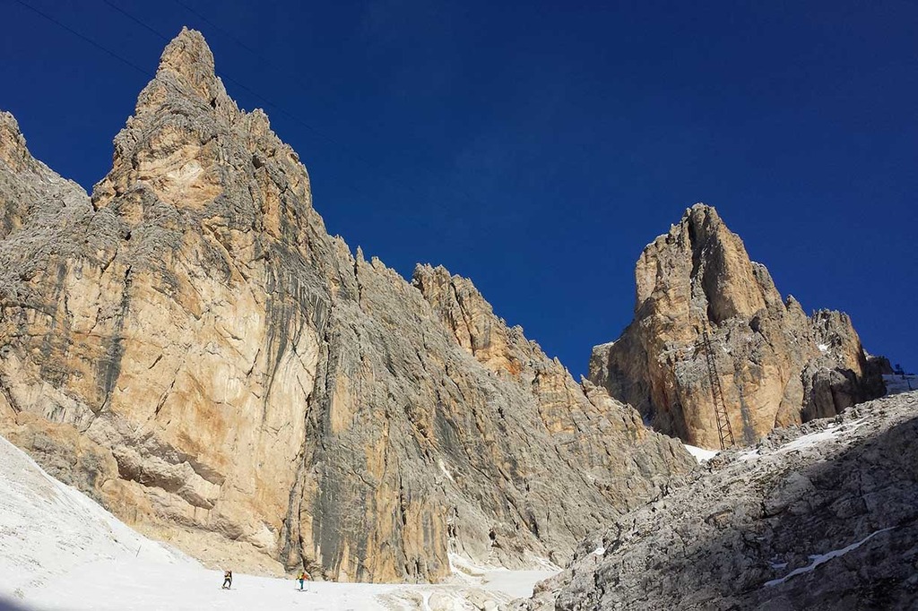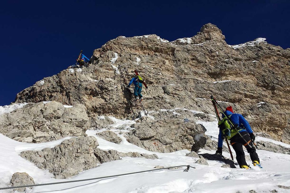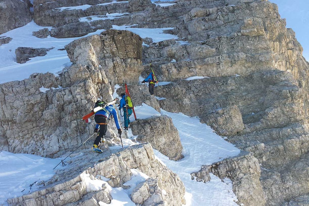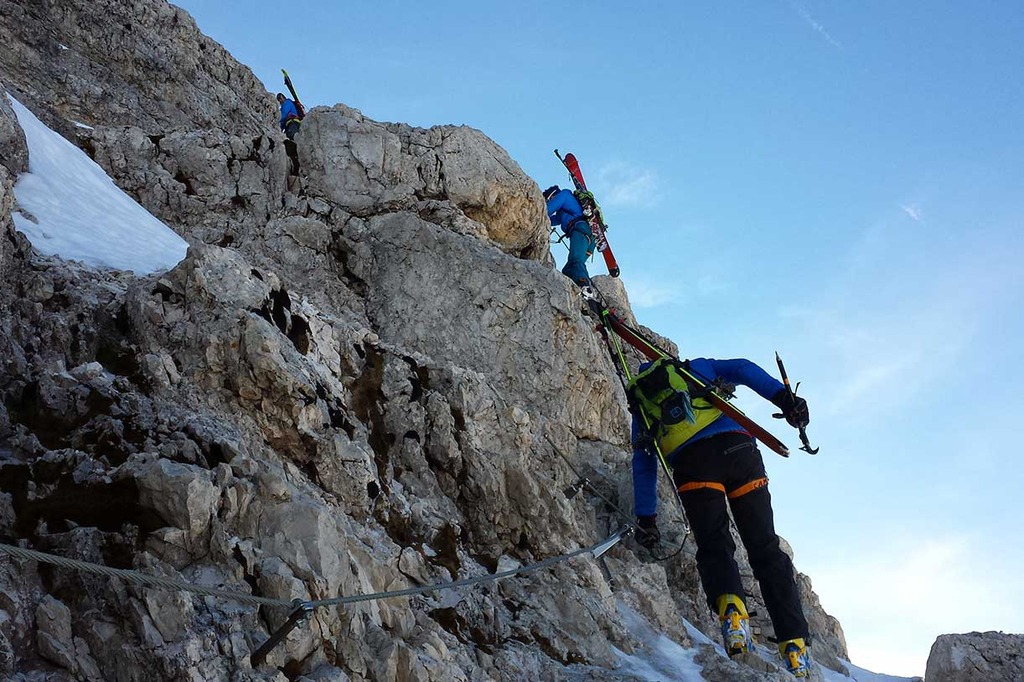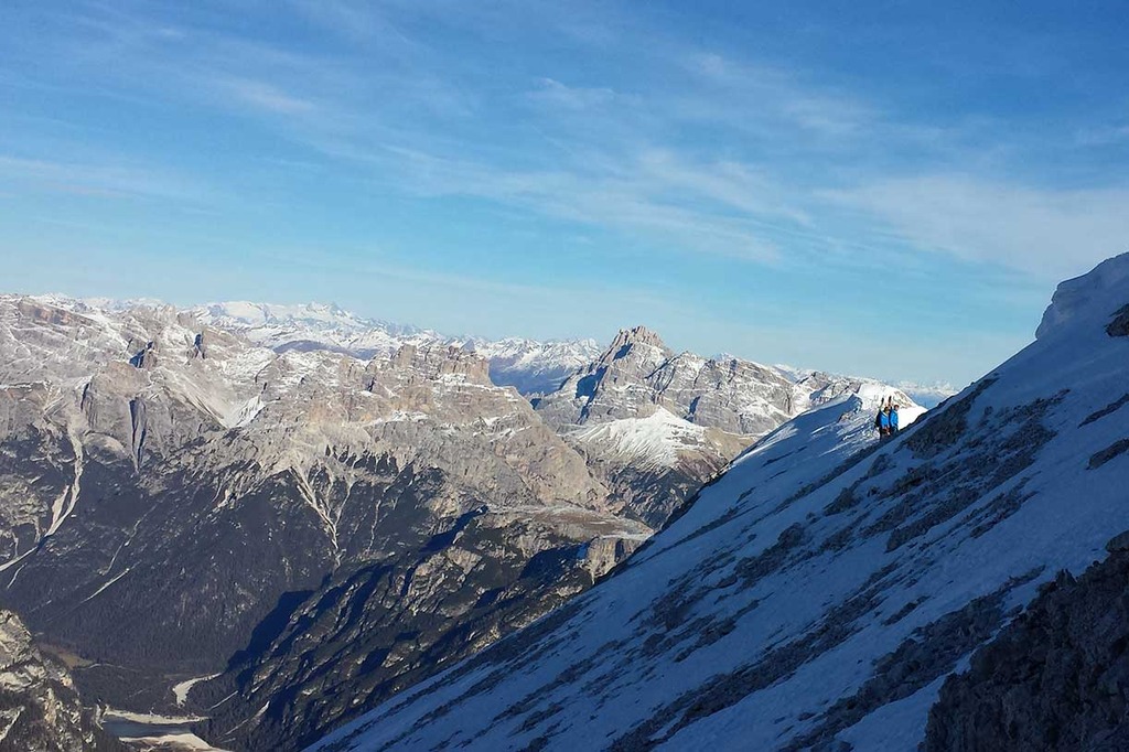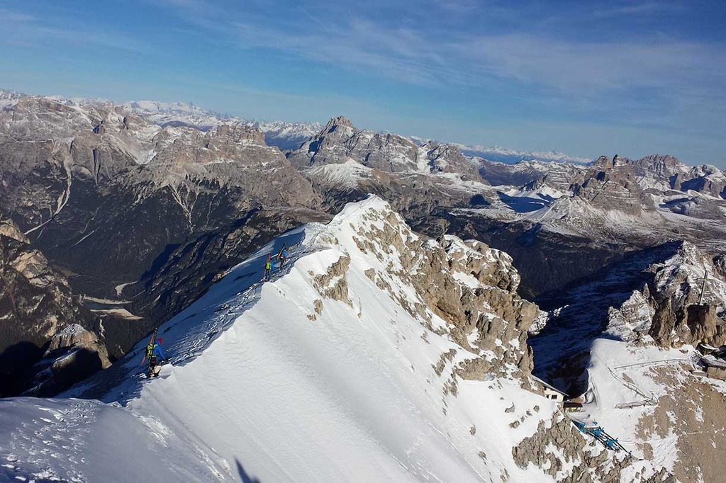 Wearing crampons, we start climbing the rocky ridge along the Via Ferrata Ivano Dibona, passing over rocky, snowy and icy sections, vertical ladders and the famous breathtaking suspended bridge at an altitude of 3,000 meters.