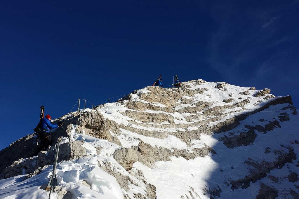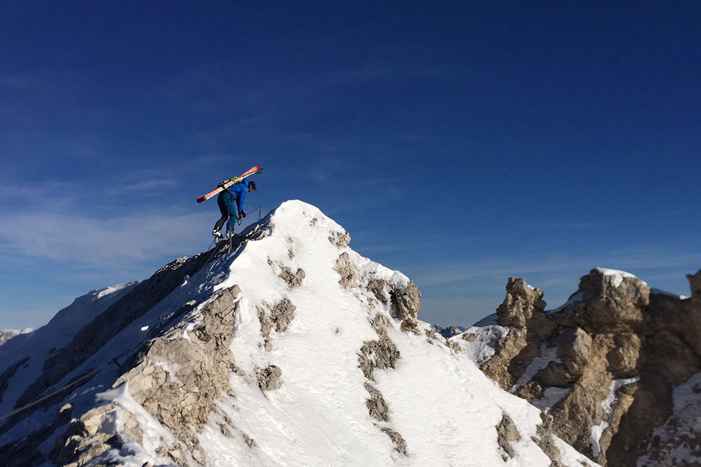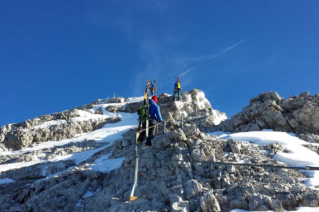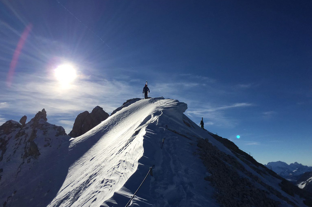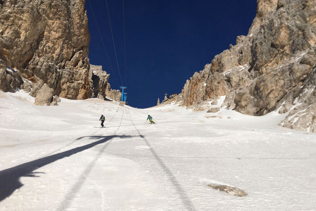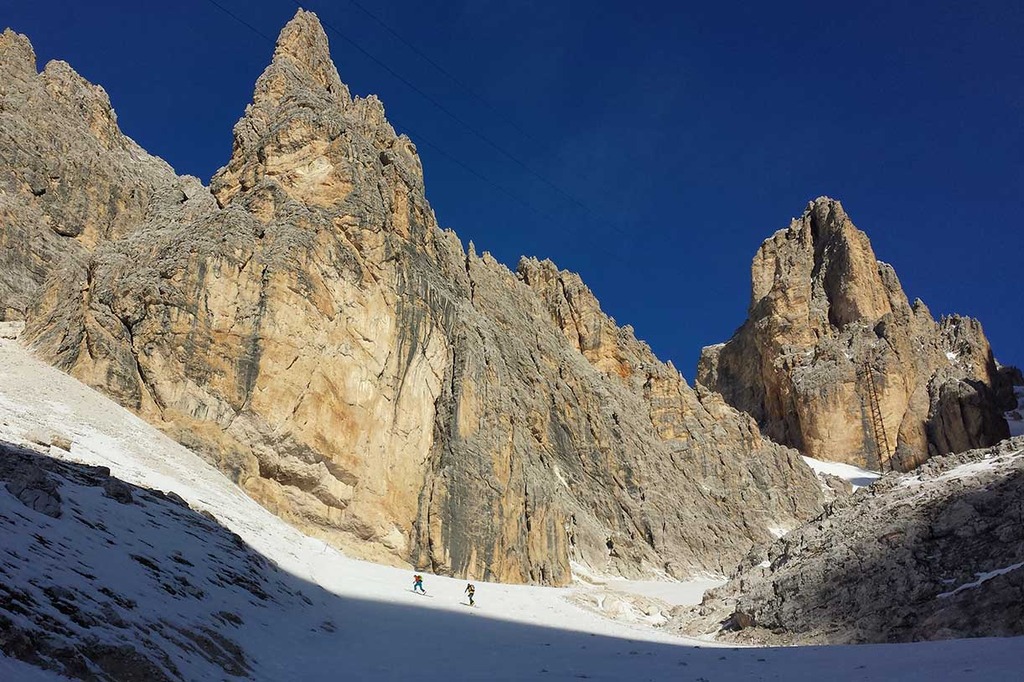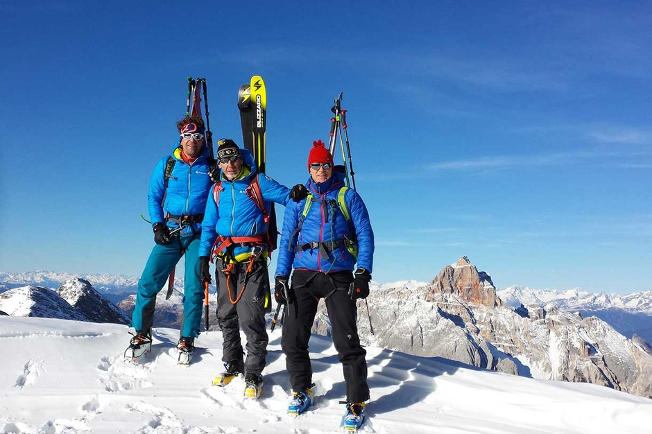 Wearing crampons, we start climbing the rocky ridge along the Via Ferrata Ivano Dibona, passing over rocky, snowy and icy sections, vertical ladders and the famous breathtaking suspended bridge at an altitude of 3,000 meters.