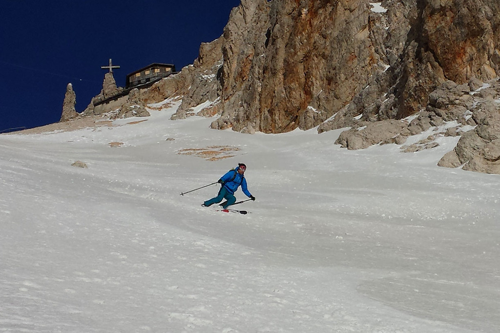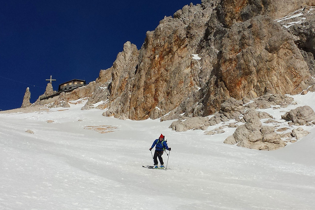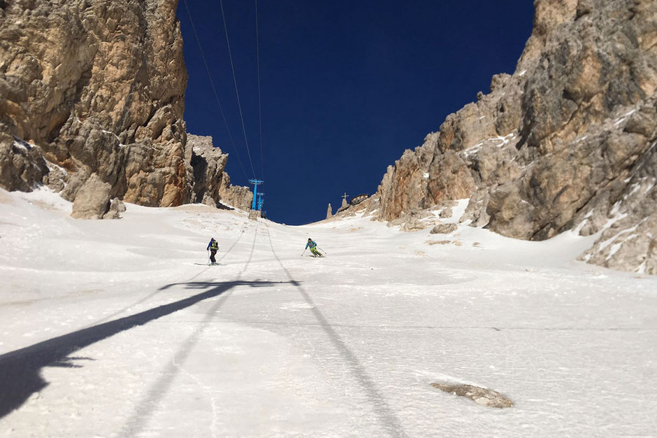 When we reach the lift’s top station, it is worth climbing a few meters more to the Lorenzi Hut (closed), to admire a fantastic and unique panorama spanning 360 degrees over the Dolomites.