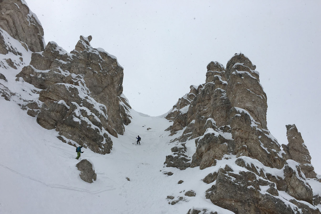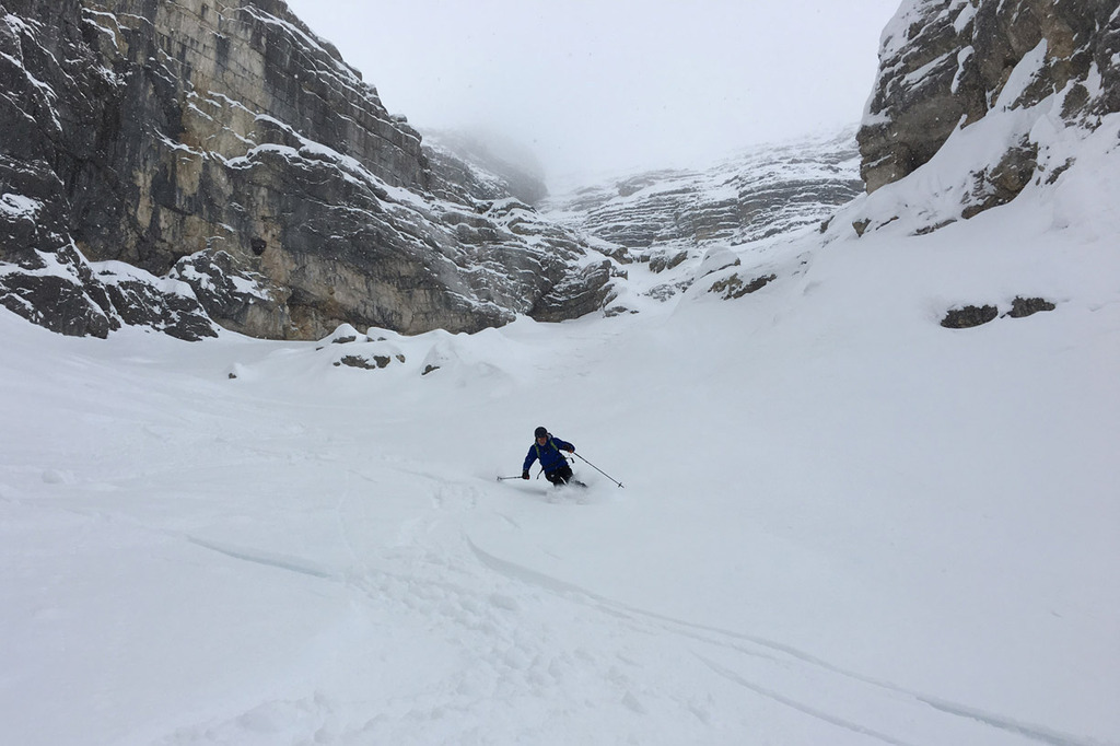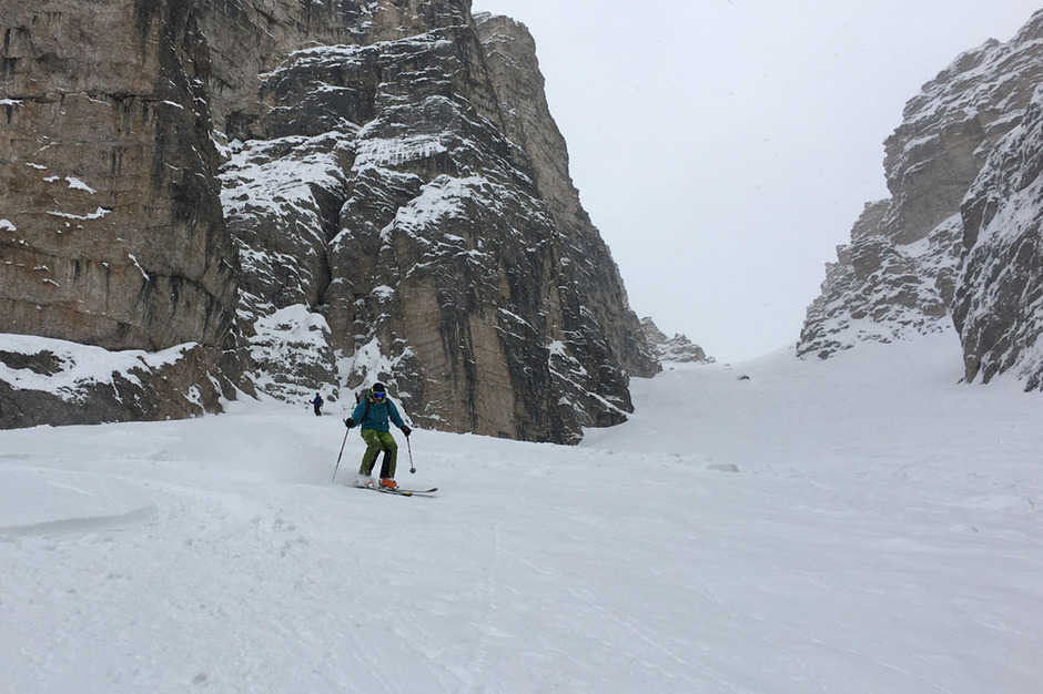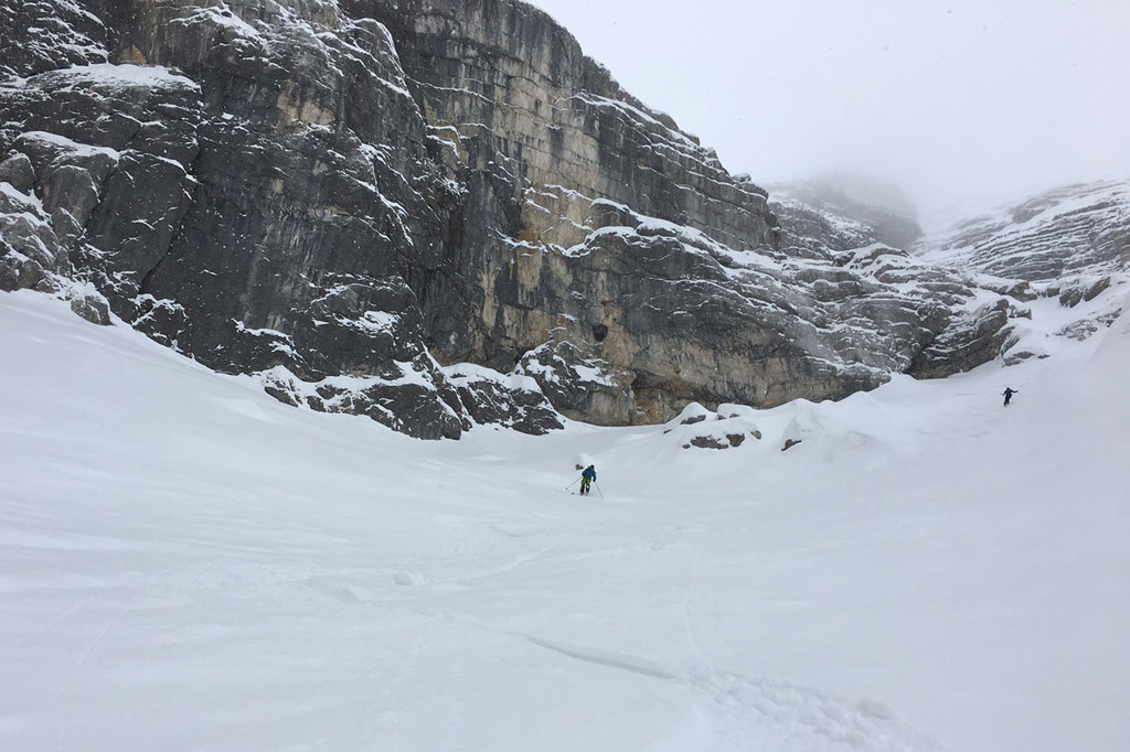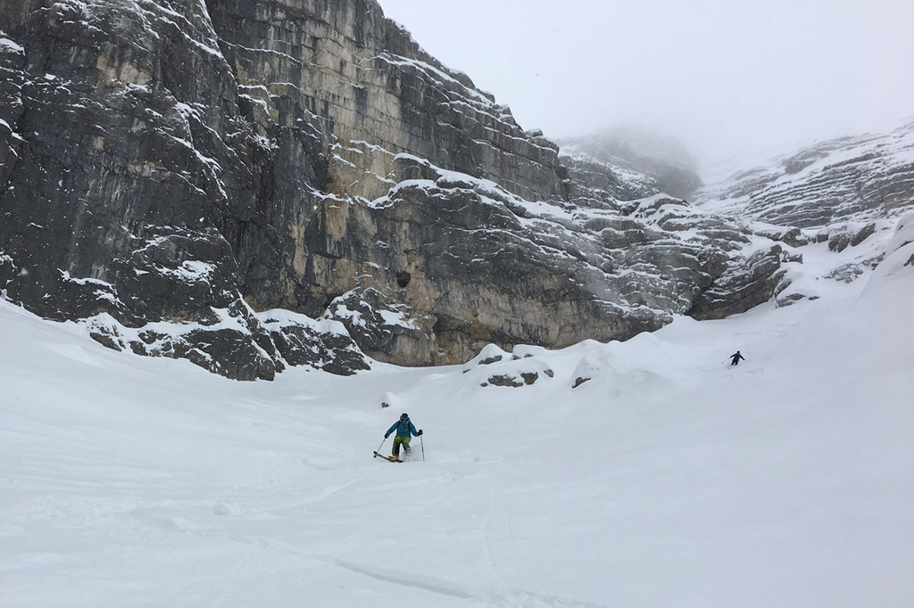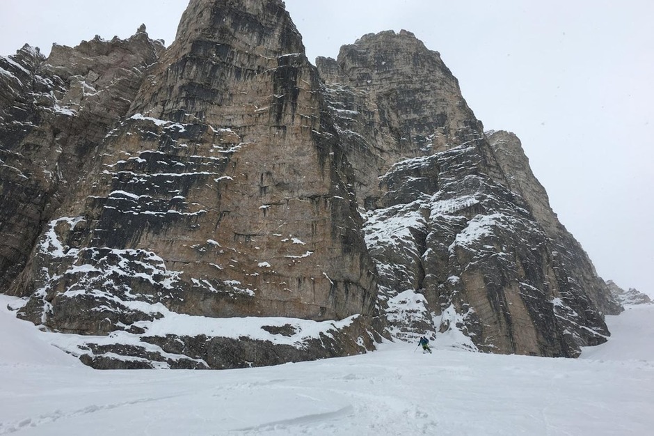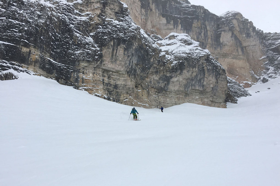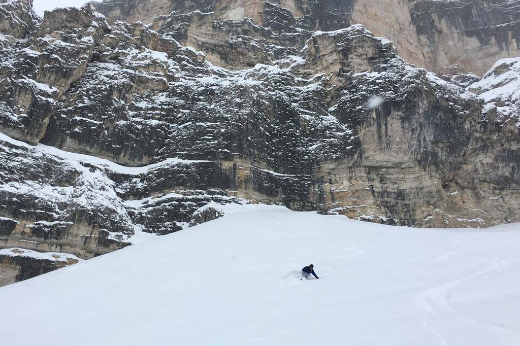 From there, the off-piste skiing descent begins: you will ski down Vallon Formenton, in majestic amphiteatres created by the surrounding peaks and along wide valleys that descend towards North to reach the cliffs of Val Travenanzes.