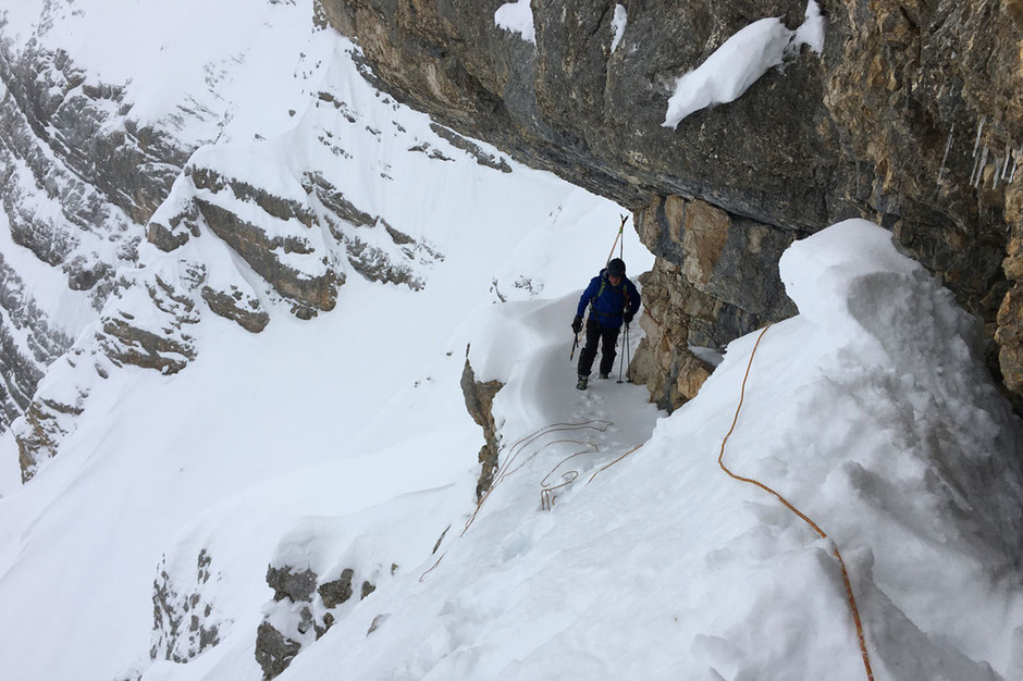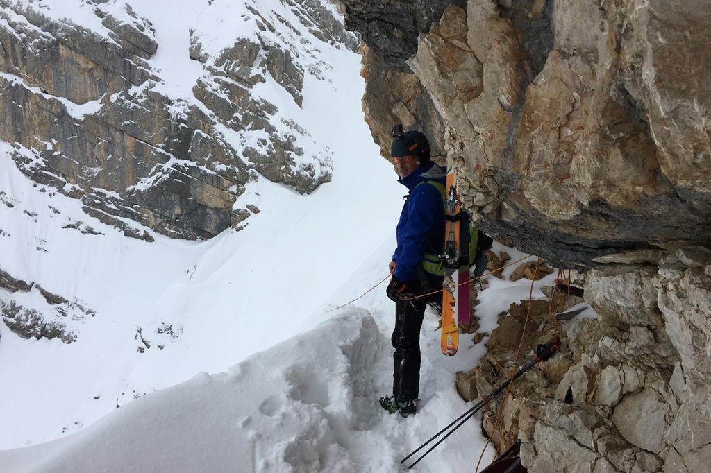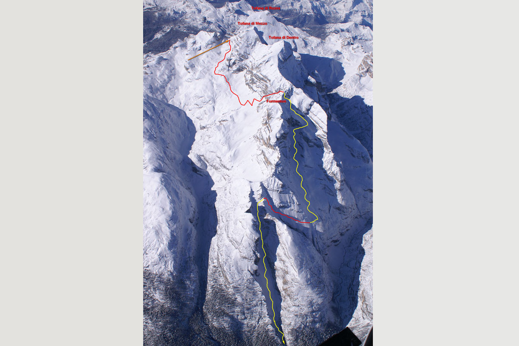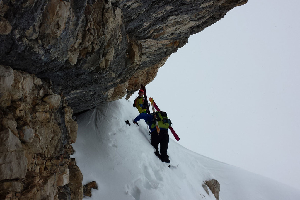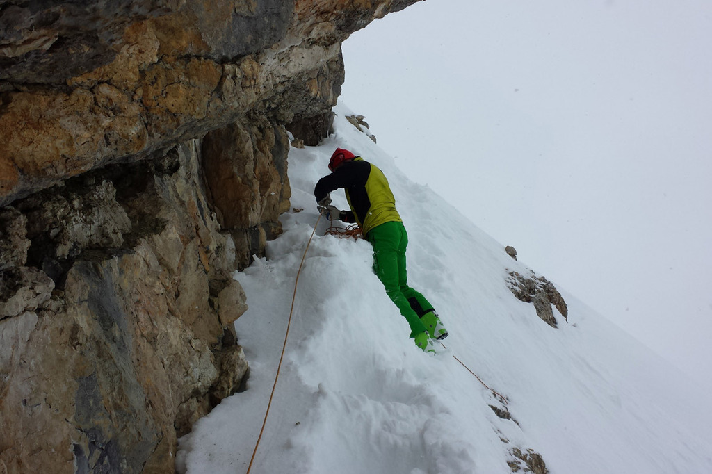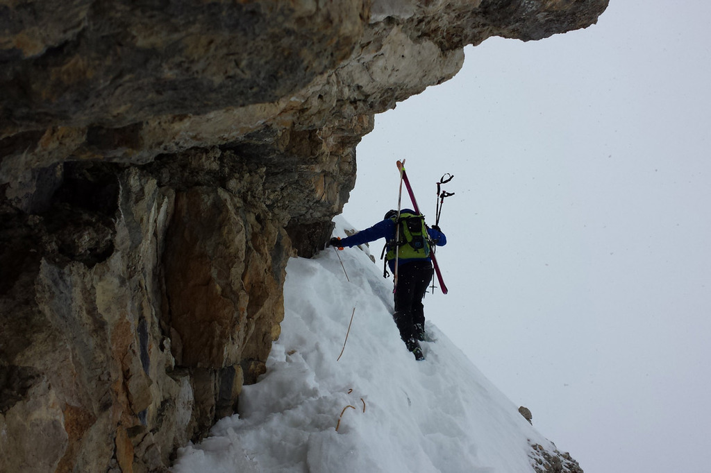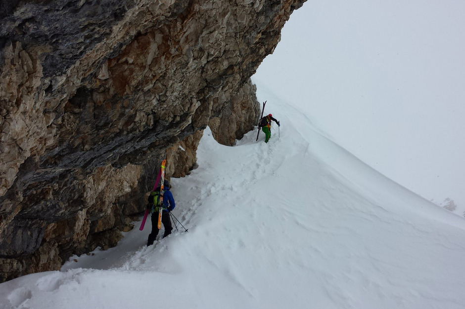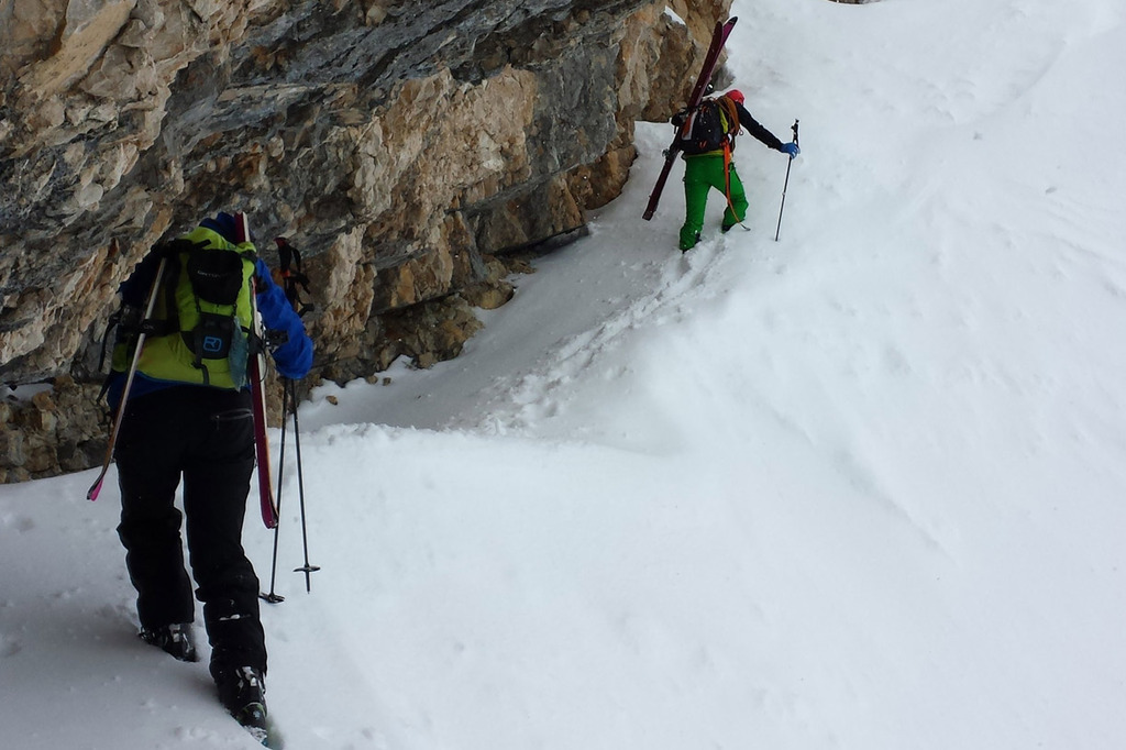 Skiing northward along a traverse at the foot of the rock faces of Tofana di Mezzo and Tofana di Dentro (Tofana Terza), you will reach a slope that goes up on the left between the peaks of Tofana di Dentro and Monte Formenton (the summer hiking trail). Climb up along the steep and narrow rill until you reach the ledge on the right, where an equipped climbing route passes (you will see the sign on the rocks) and which leads up to the side of Monte Formenton, at 2830 metres a.s.l..