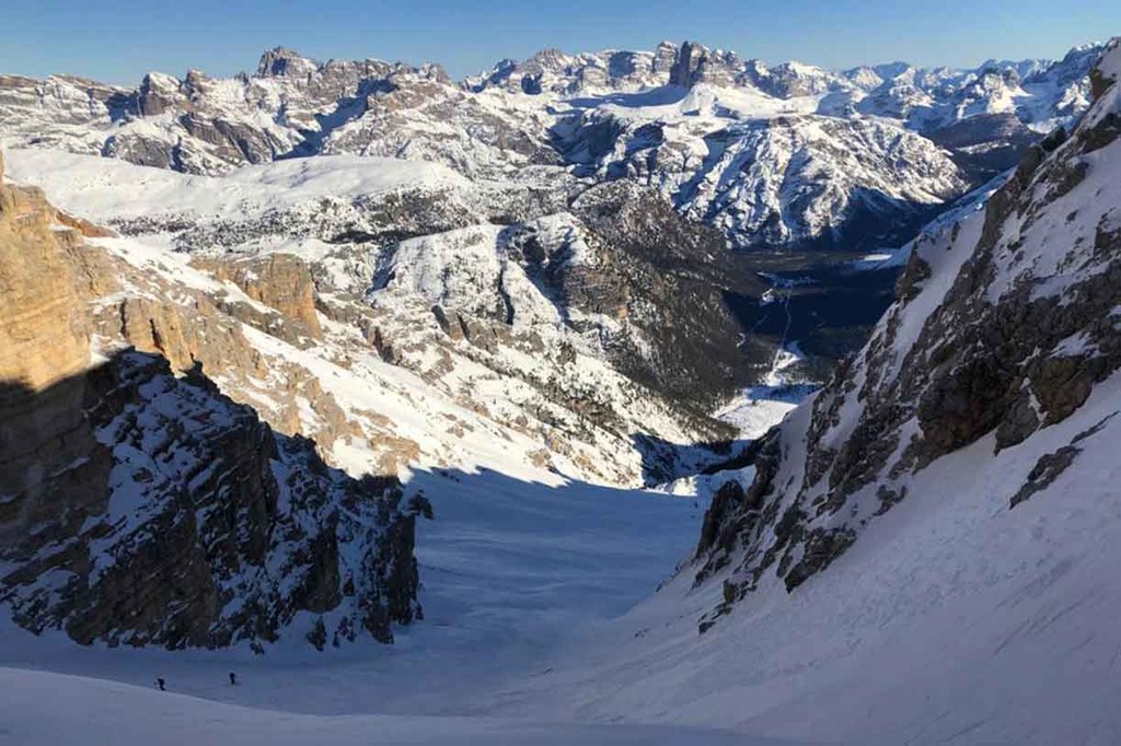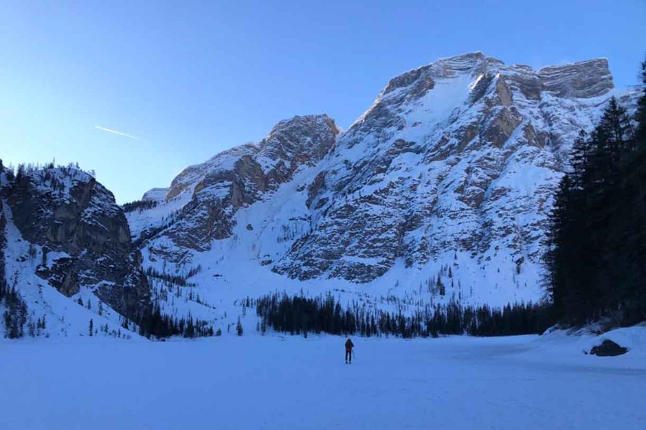 From the summit we drop down to the Forcella Sennes which allows us to enter a magnificent natural amphitheater that faces North and leads us to Val dei Lerici. Following the valley, we gently come down surrounded by beautiful landscapes as we return to the frozen Lago di Braies.