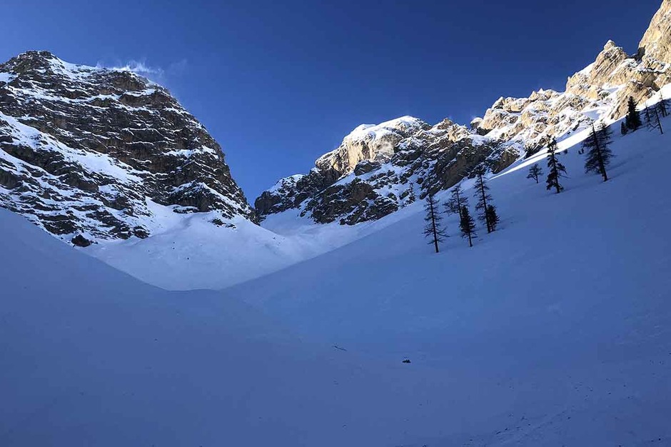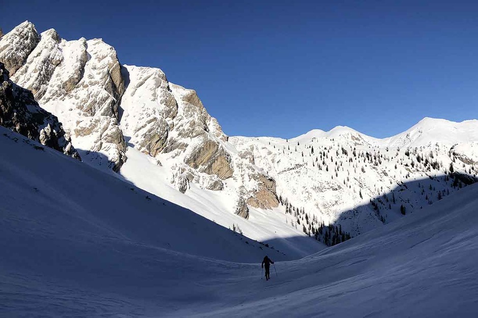 This ski mountaineering excursion at Lago di Braies starts from the large toll parking lot at Braies where we begin crossing the frozen lake and we enter the Val Foresta woods.