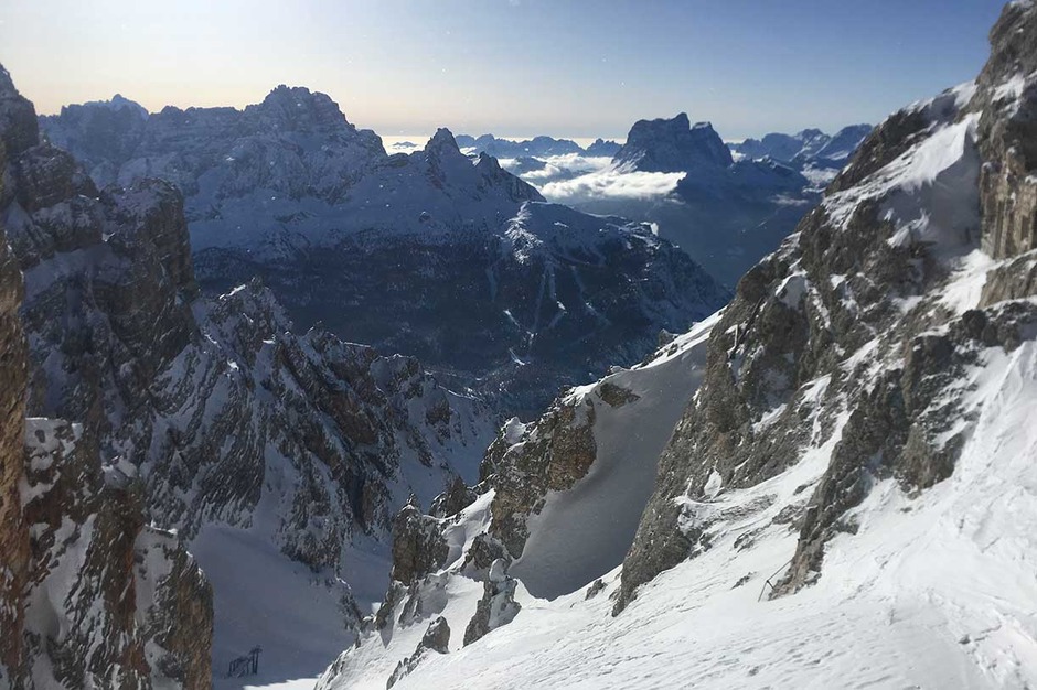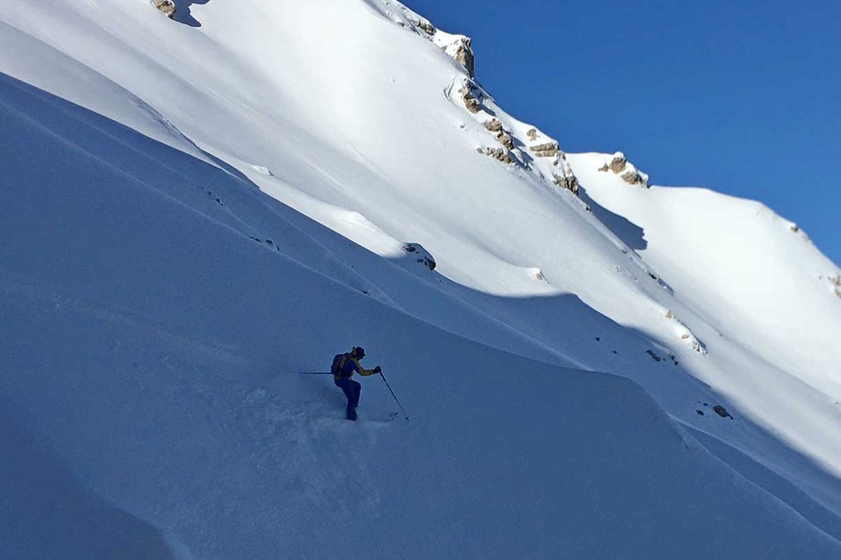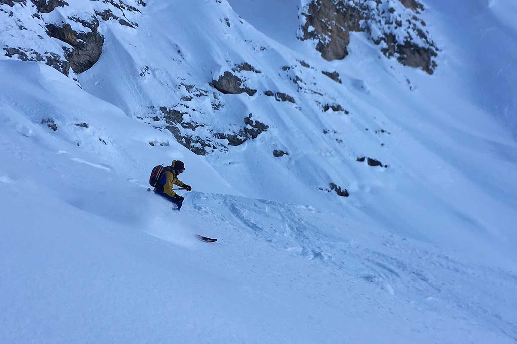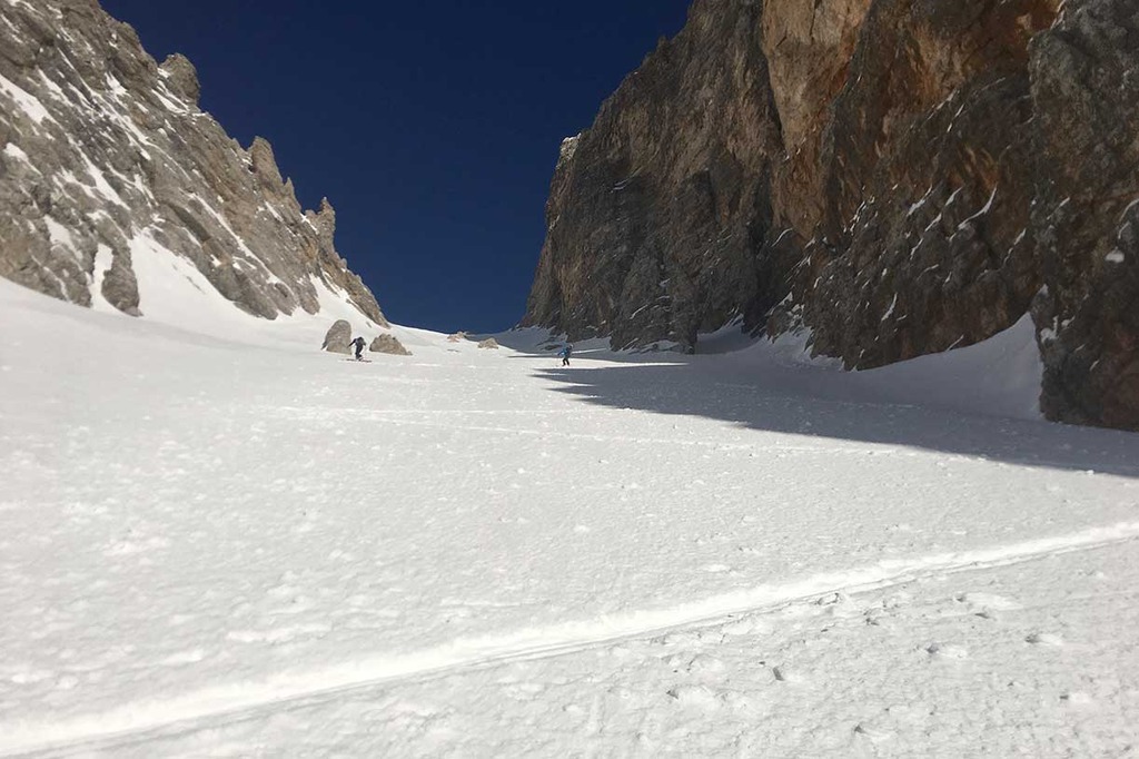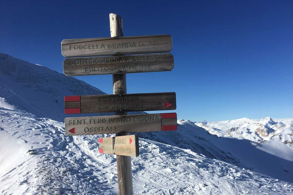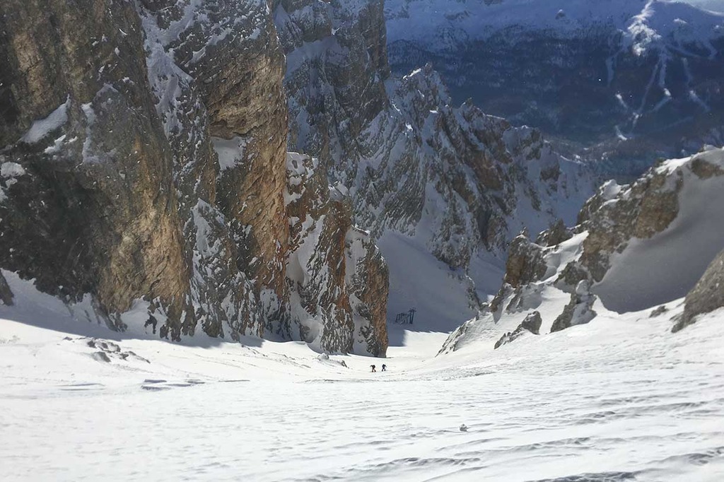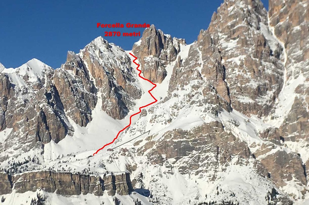 Once the seal skins are on, we climb along the old ski slope Staunies to the descent system half way down the couloir. Then we climb on the left valley taking us to 2870 meters at Forcella Grande.