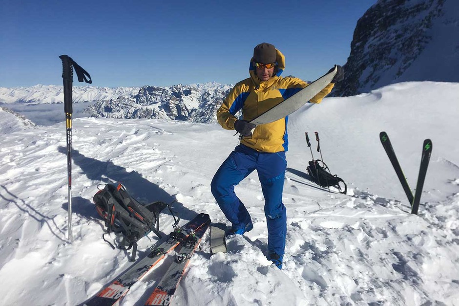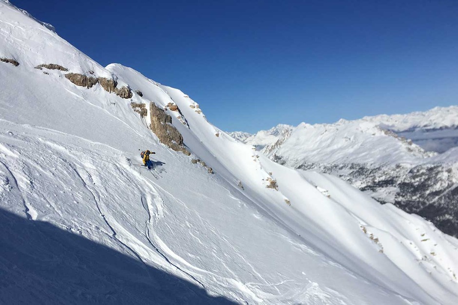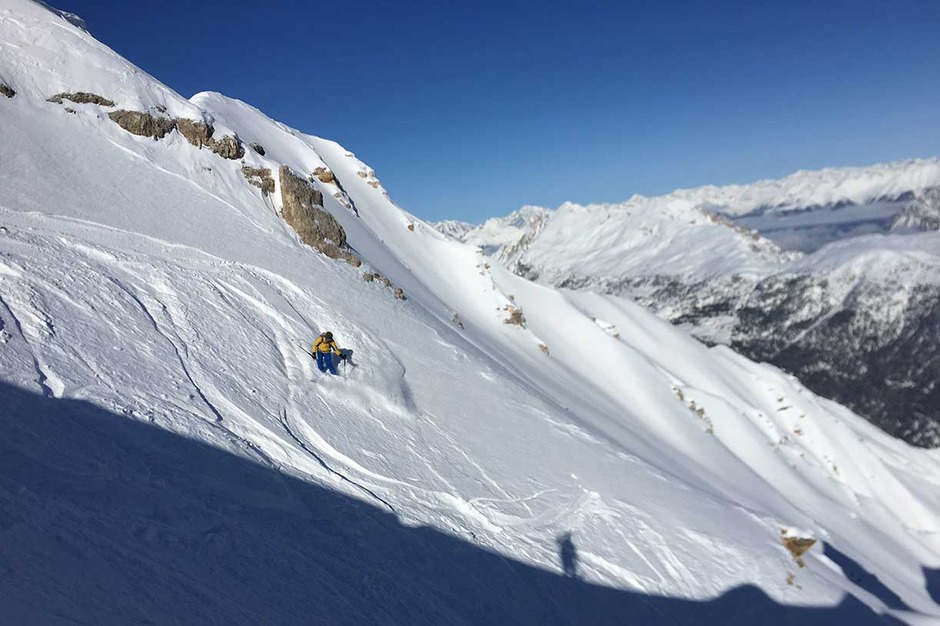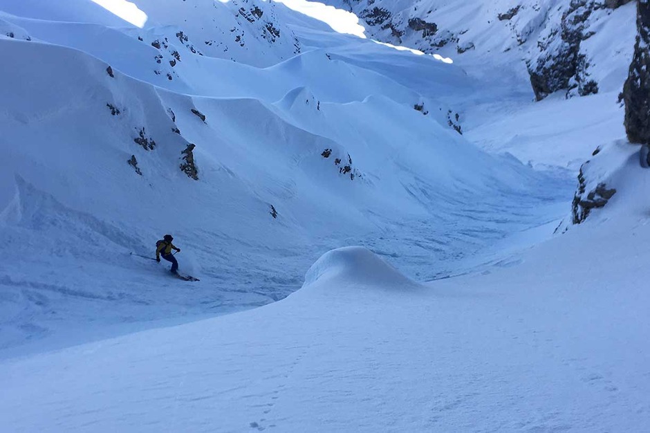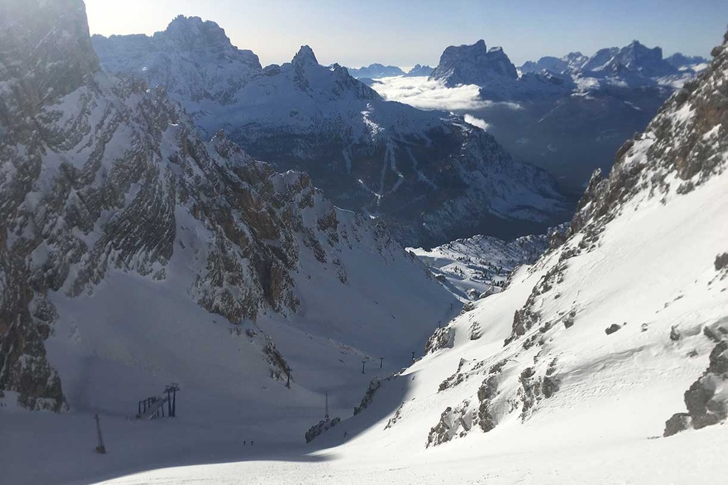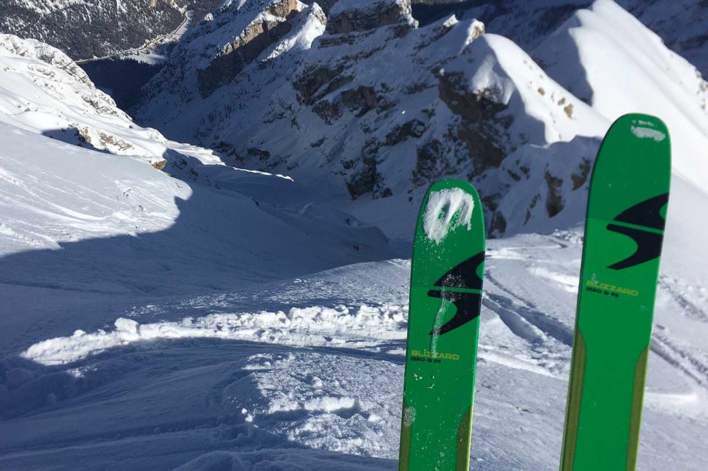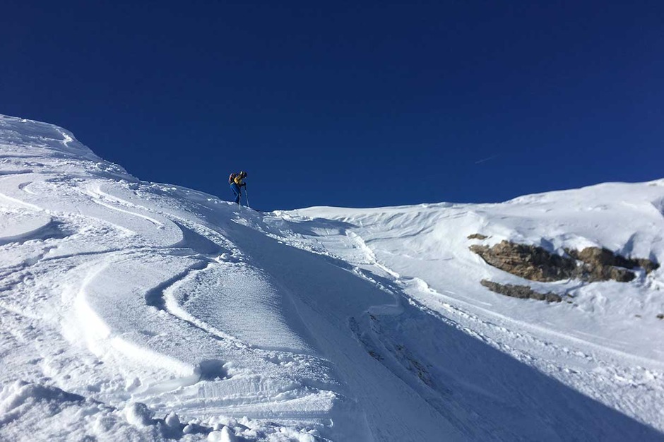 Once the seal skins are on, we climb along the old ski slope Staunies to the descent system half way down the couloir. Then we climb on the left valley taking us to 2870 meters at Forcella Grande.