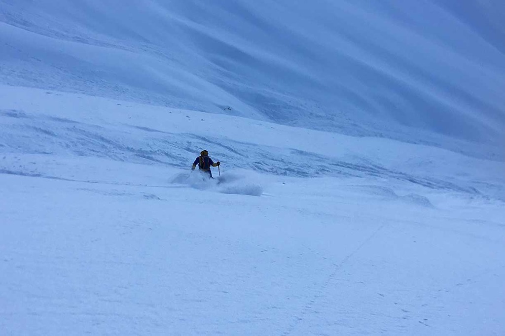 The first part of the descent is pretty steep, about 38 degrees, up to the entrance of the beautiful valley descending until it narrows into a small riverbed. Then keeping on the right and going across we enter a forest leading us near the cross country trail.