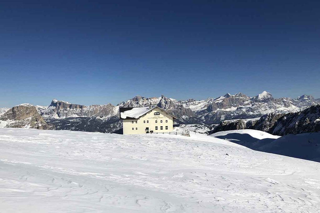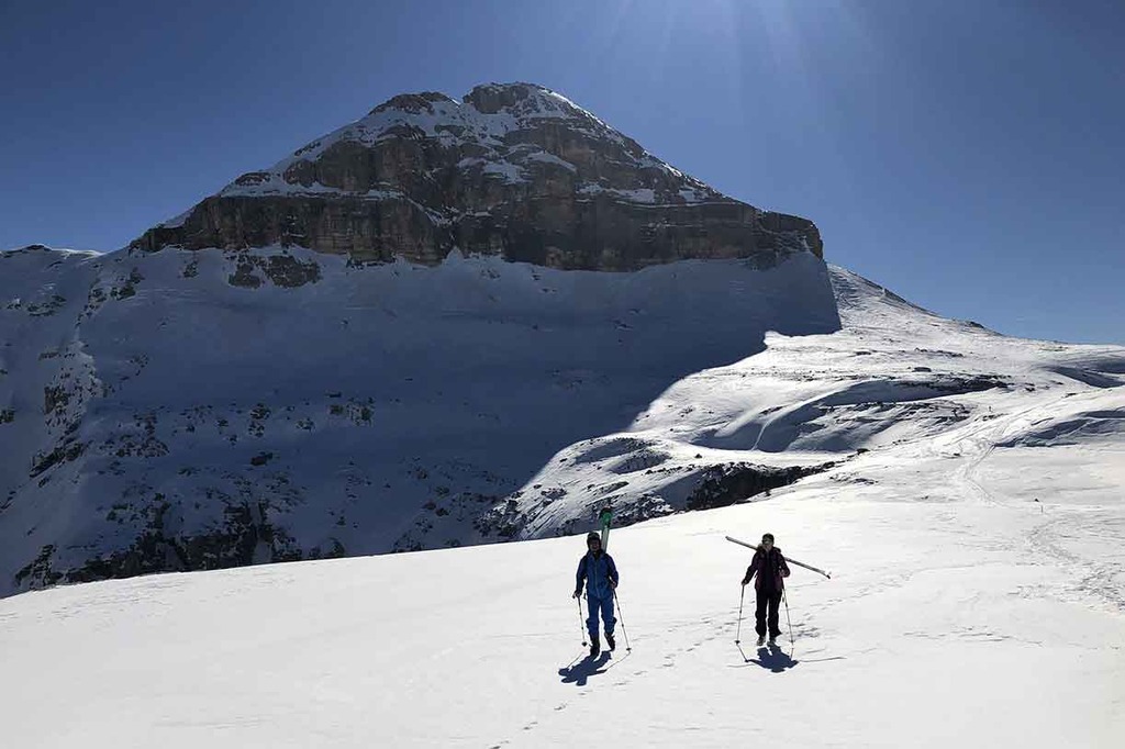 Taking advantage of the lifts, from Corvara we reach Passo Pordoi, where a modern cablecar will take us to Rifugio Maria at 2950 meters. Straight from the cabin’s terrace, we ski down to the Forcella Pordoi and on to the start of a short climb.