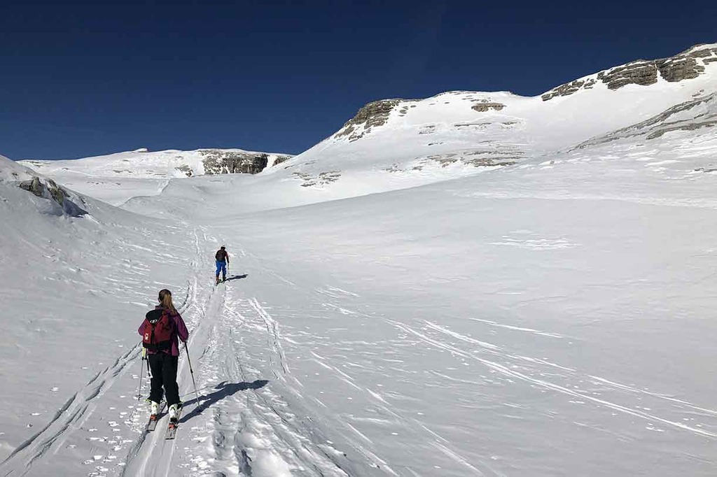 We put our sealskins on and begin a long semi-circular traverse, reaching the Rifugio Boè first. Then we get to the entrance of the valley called Pisciadù, where we often need to overtake a large snow ledge. The Pisciadu' valley is quite wide and a real pleasure to ski.