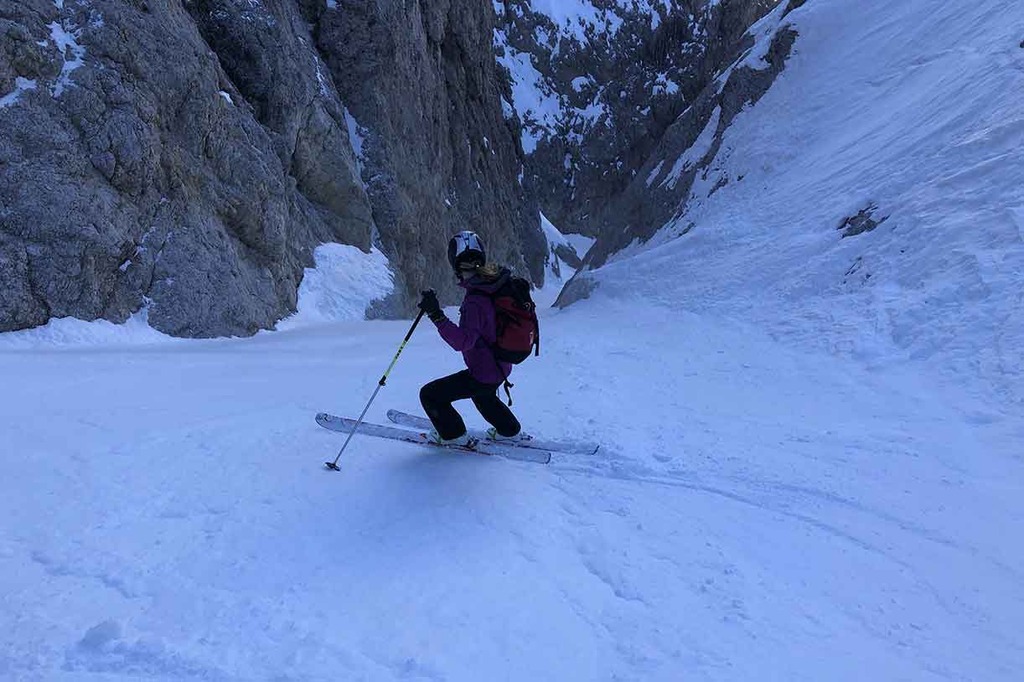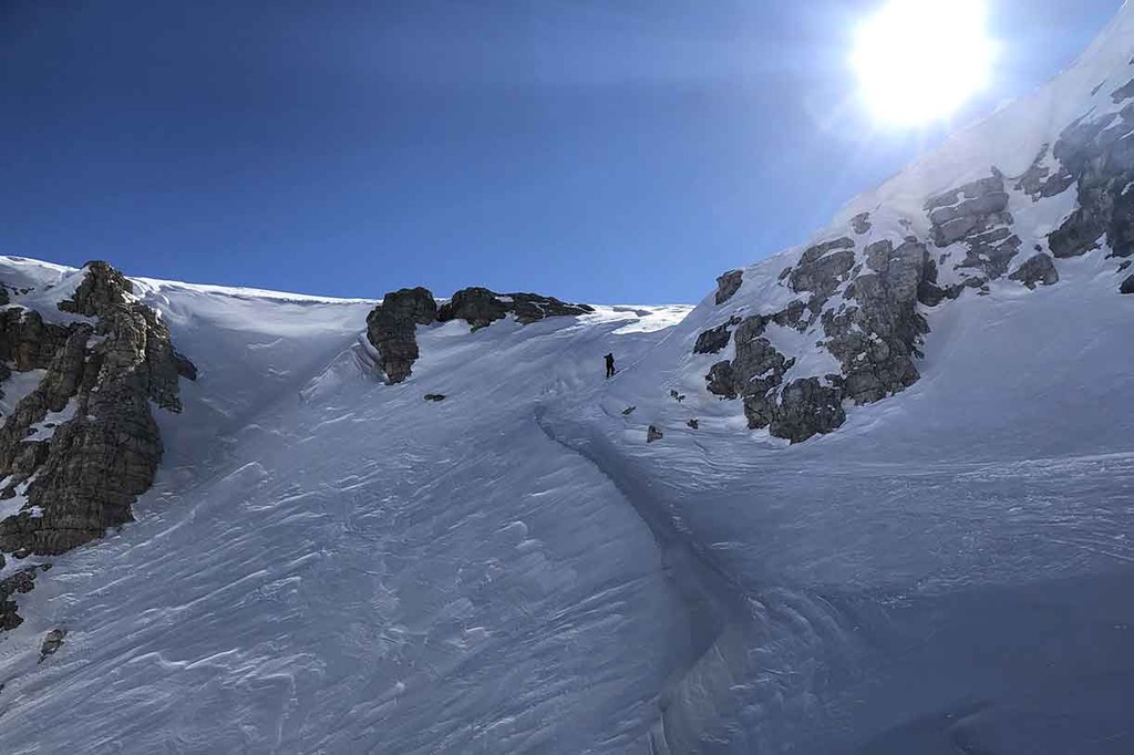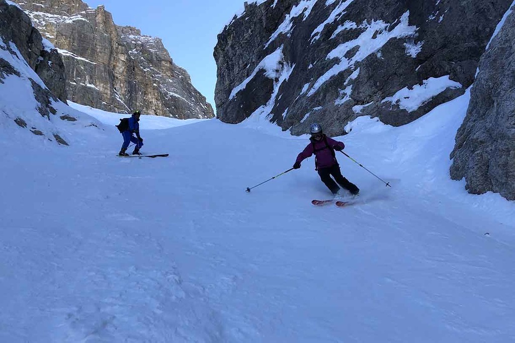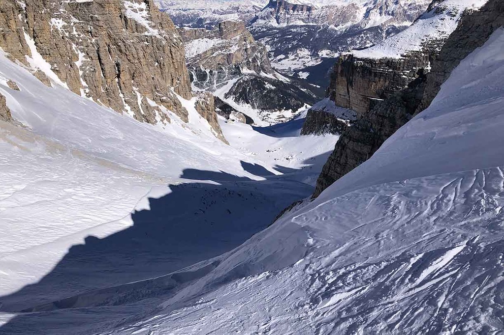 In proximity of Rifugio Pisciadù we put our sealskins back on and we cross westward until we reach the entrance of the Val Setus couloir. The first part is quite steep and narrow, while the second part is less challenging and offers a fun and relaxing ski run.