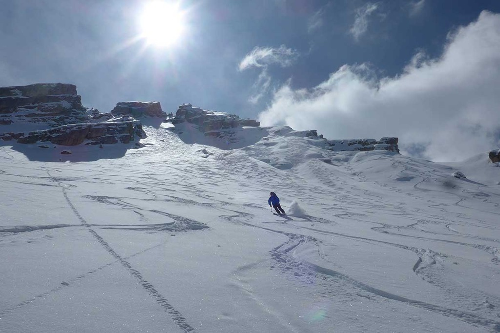 We ski downhill following along varied and articulated slopes toward Tadega Pass, finally reaching the Fanes Lodge for dinner and the overnight stay.