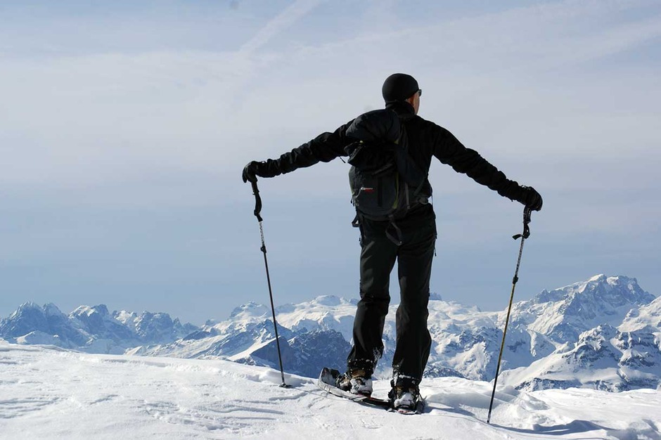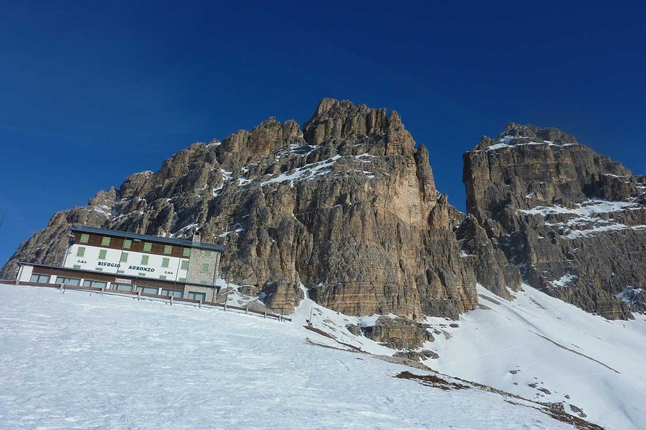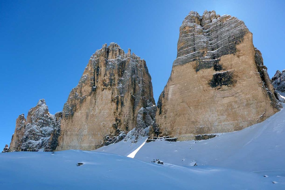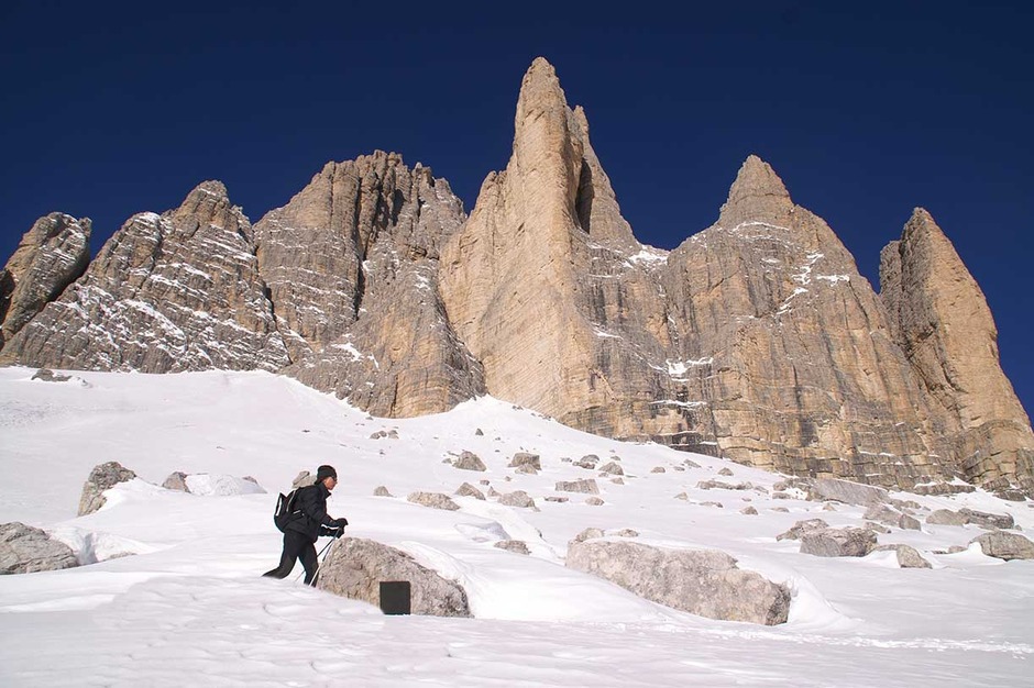 The snowshoes excursion to the Tre Cime di Lavaredo starts at the Auronzo Lodge and follows the summer trail counterclockwise up to the Lavaredo Fork, a strategic point to admire a 360 degree view of the surrounding mountains.
