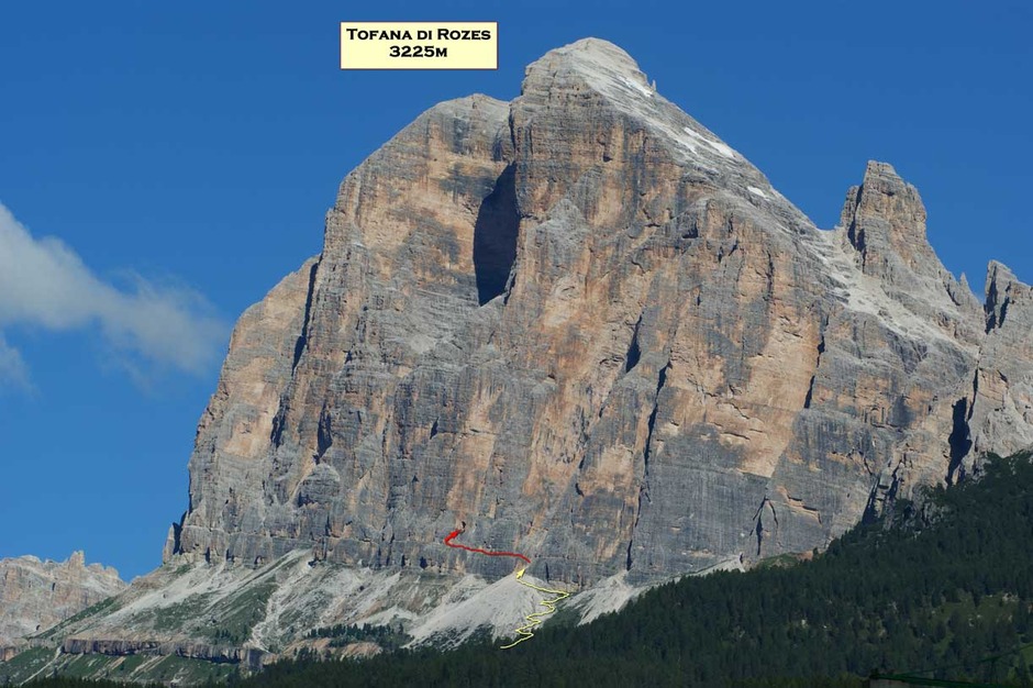 The trail, which leads to the foot of the rock face, starts from the mountain hut Rifugio Dibona, 2089 metres a.s.l., is well signposted and includes a very steep and demanding section.