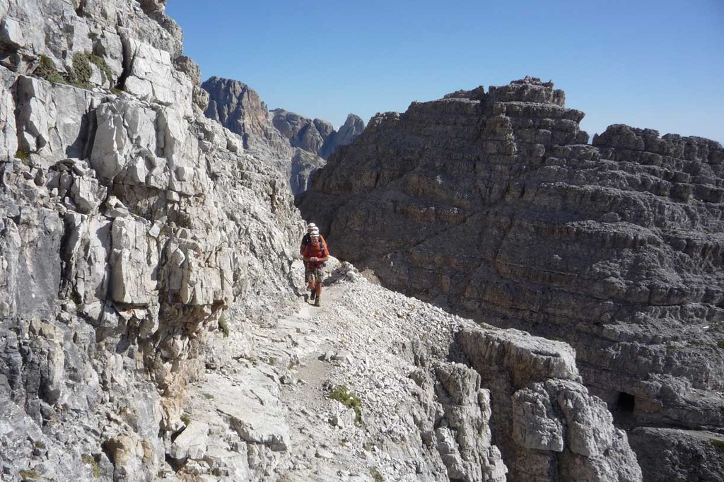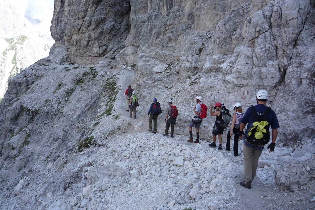 From Rifugio Pian di Cengia we will climb up the easy Via Ferrata del Pian di Cengia, that was built along the First World War trenches and tunnels that can still be seen on these crests, and reach the Tre Cime di Lavaredo, from where we will go by bus to Auronzo di Cadore and then take the shuttle bus to Cortina.