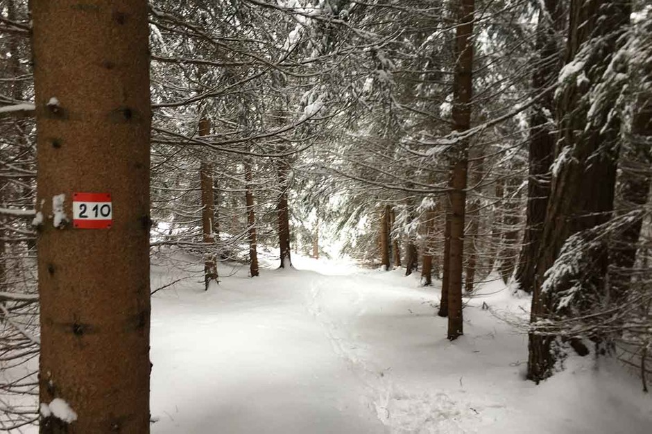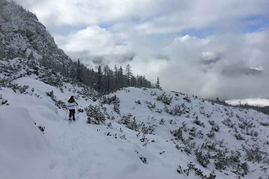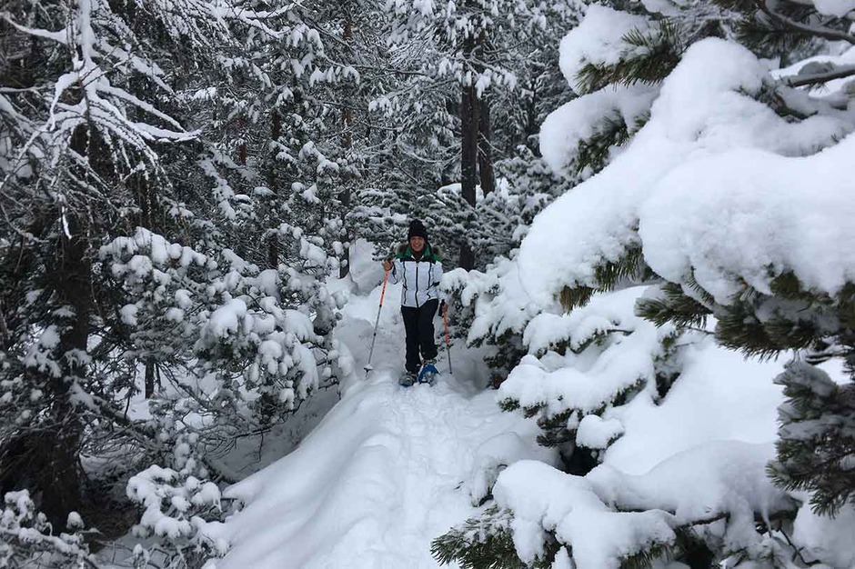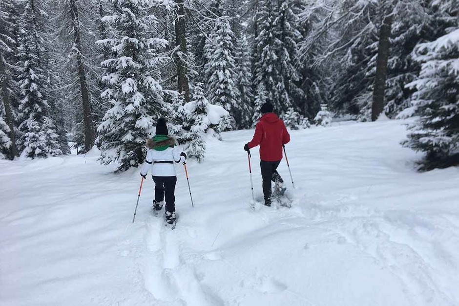 The itinerary for the trek on snowshoes in the woods follows the trail skirting the base of Monte Faloria, offering a great panorama on Pomagagnon, Tofane, 5 Torri, and the Croda da Lago overlooking Cortina.