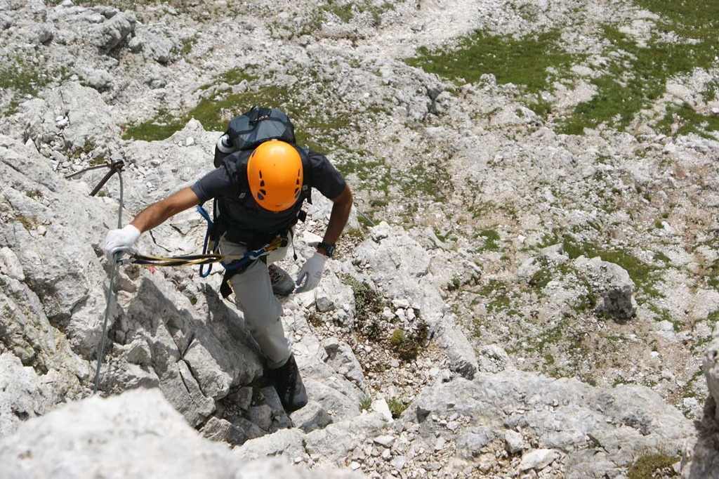 The elevation gain of the Via Ferrata Renè de Pol is 1000 metres (and the elevation loss when descending is 1000 metres as well). The route passes on trails that are not always easily accessible and maintained, thus, the climber needs to have a good sense of direction and ability to proceed in a quite challenging, harsh mountain environment.
