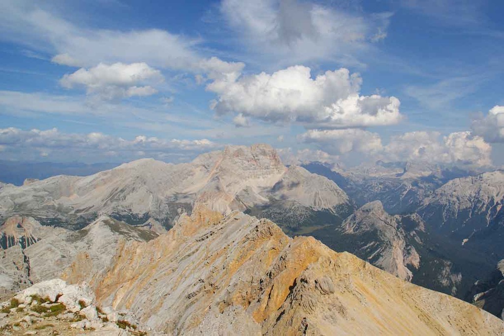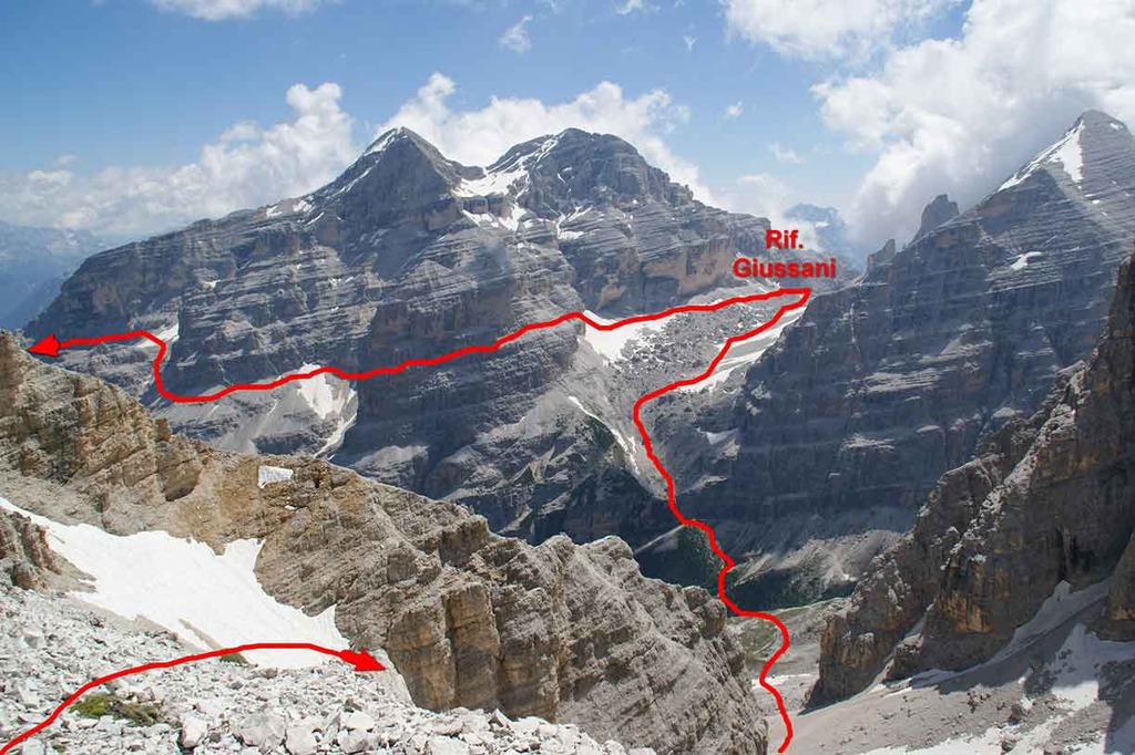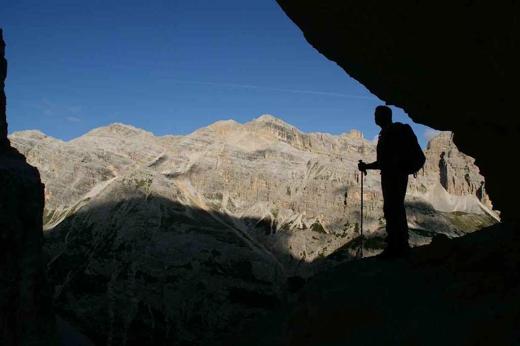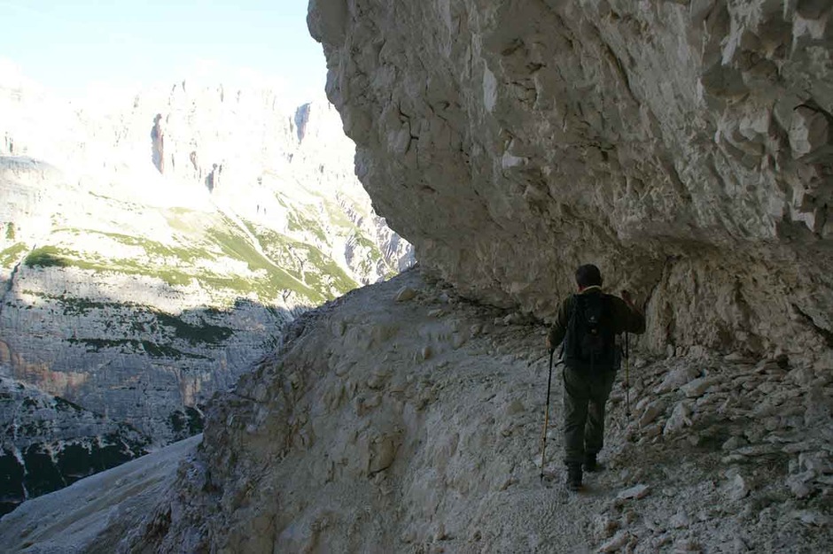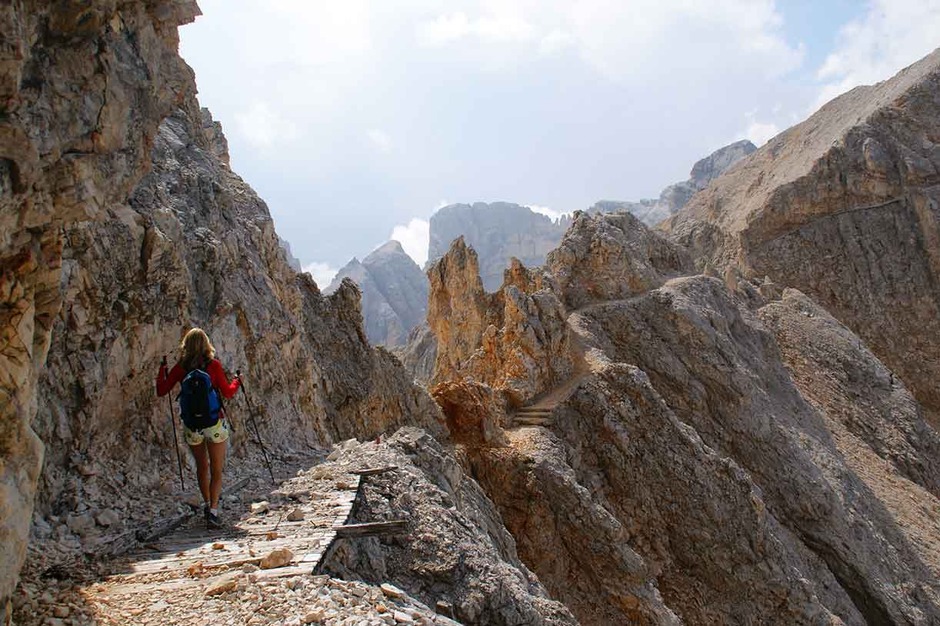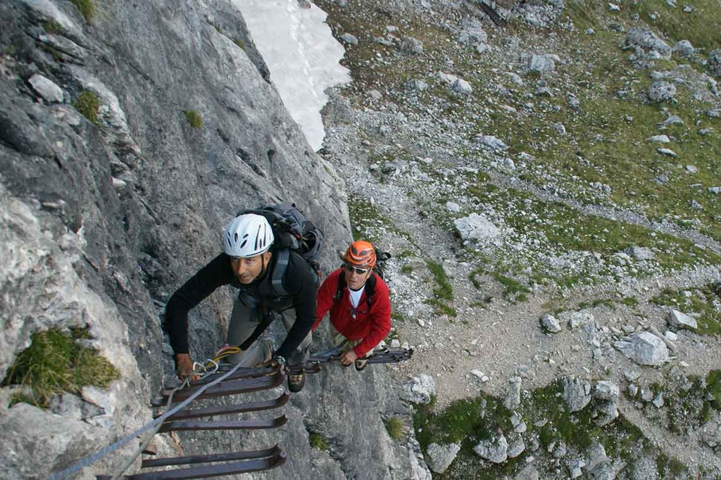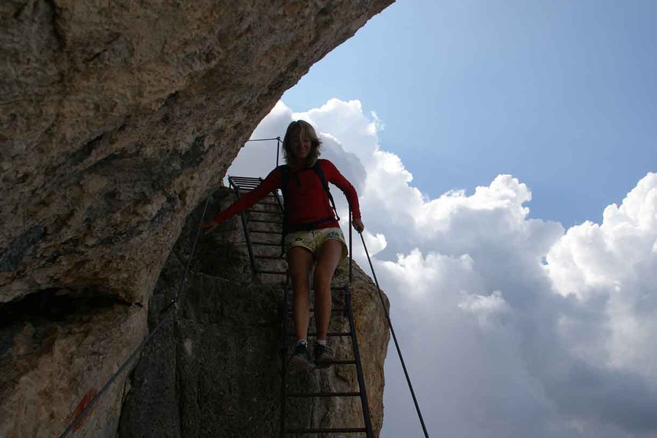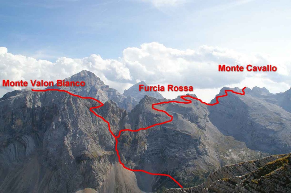 A day through history, tracing part of the Austrian front in the Great War along the watershed ridge at Furcia Rossa mountain. Near the end we tackle a nice via ferrata unfolding in part along ledges carved either by nature or by the Austrian Army. We start at 2912 meters on the summit of Monte Cavallo, on the way down along Val Travenanzes, climbing back up again to Rifugio Giussani, handling a very particular stretch of via ferrata named the Meneghel Ladder.