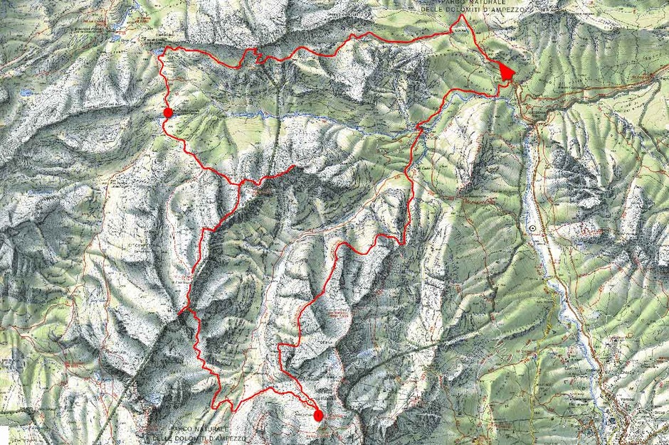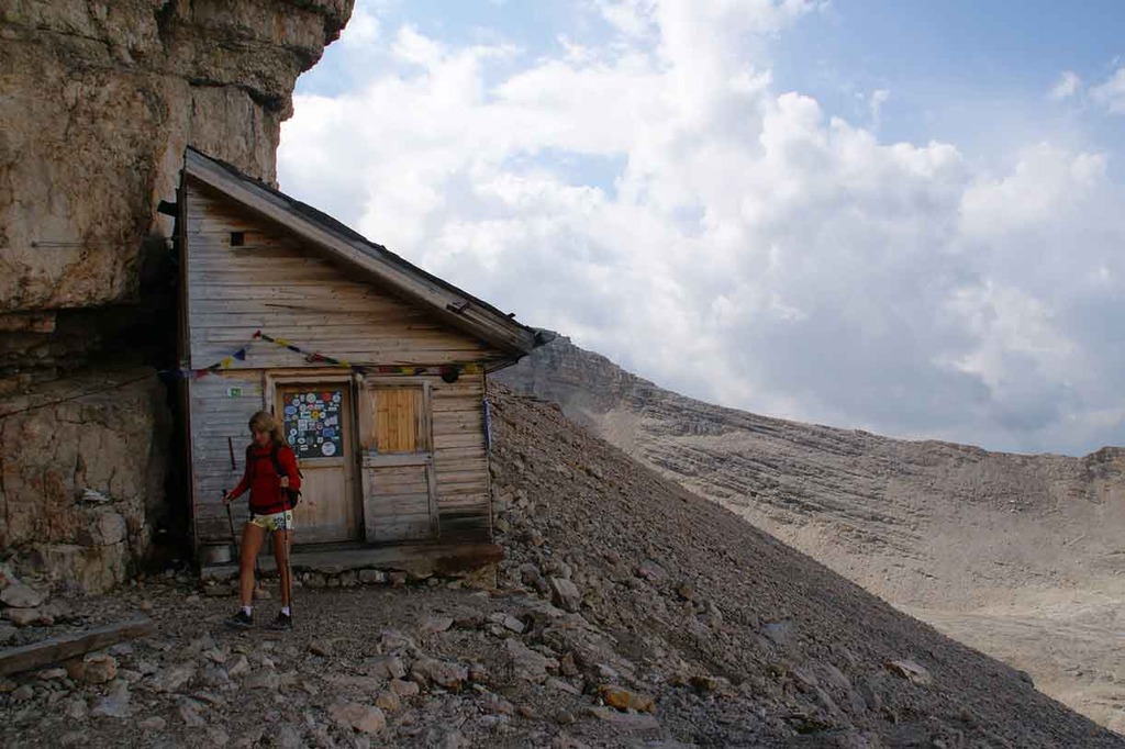 We leave from the Saint Umberto parking lot located north of Cortina toward Antrulies following trail #418 reaching the cross on the summit of Col Becchei at 2794 meters. The colors of the rocks that vary from blood red to bright orange with dark brown shades in between are truly amazing. We spend the night at Malga Grande di Fanes, run by a nice shepherd and his family and offering an authentic local dinner and breakfast.