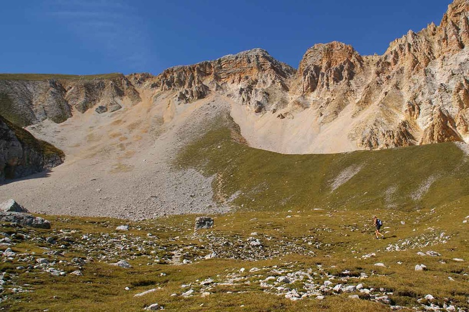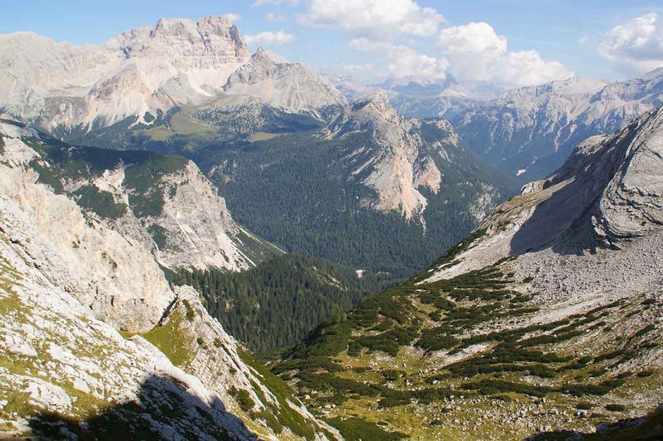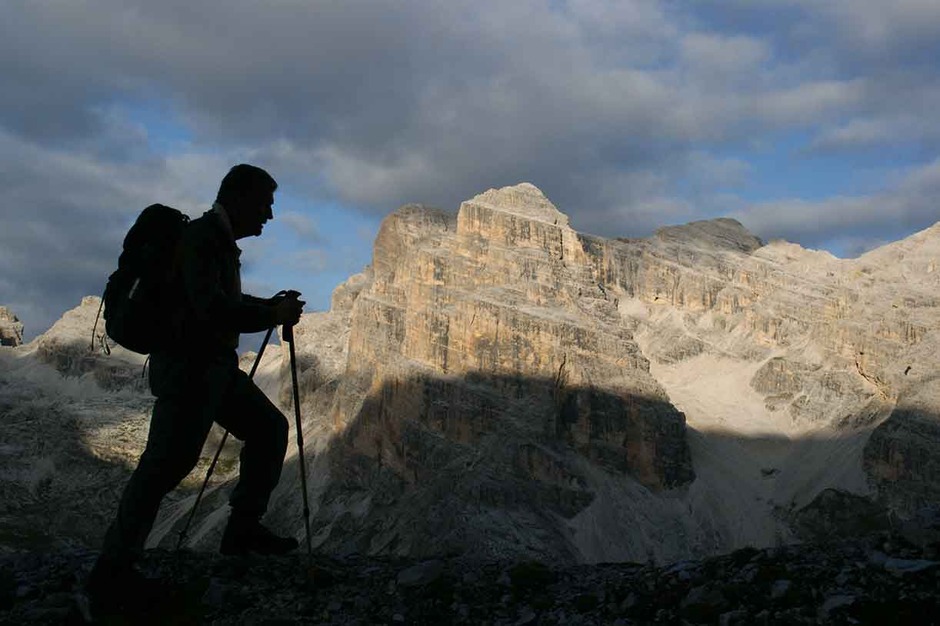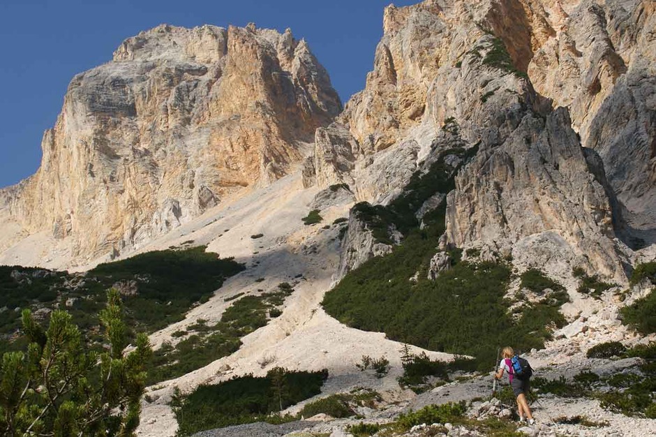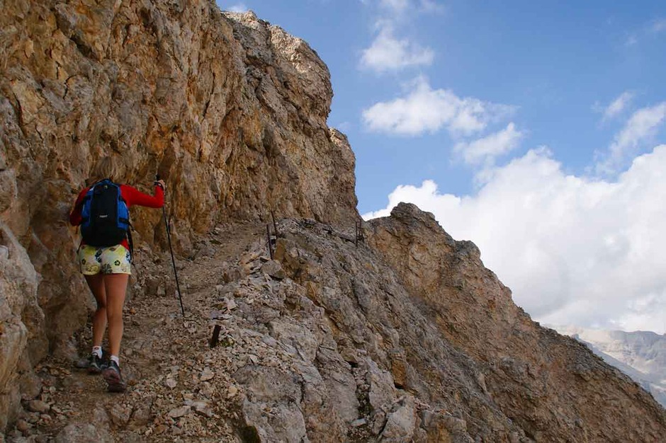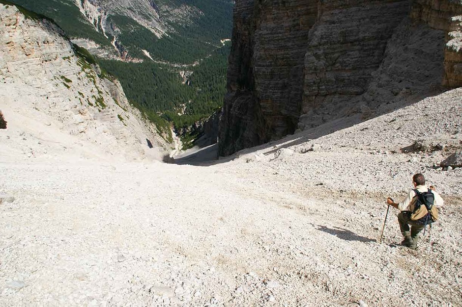 It’s an intense and adventurous day along the Cengia Paolina on ledges and screes that cross the majestic north faces of the Tofanas. This trail is well known only to the Alpine guides as it is not marked or drawn on tour books or maps. At the end we follow a long and amusing scree that leads us back to the starting point of our adventure in the Dolomites.