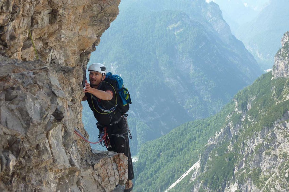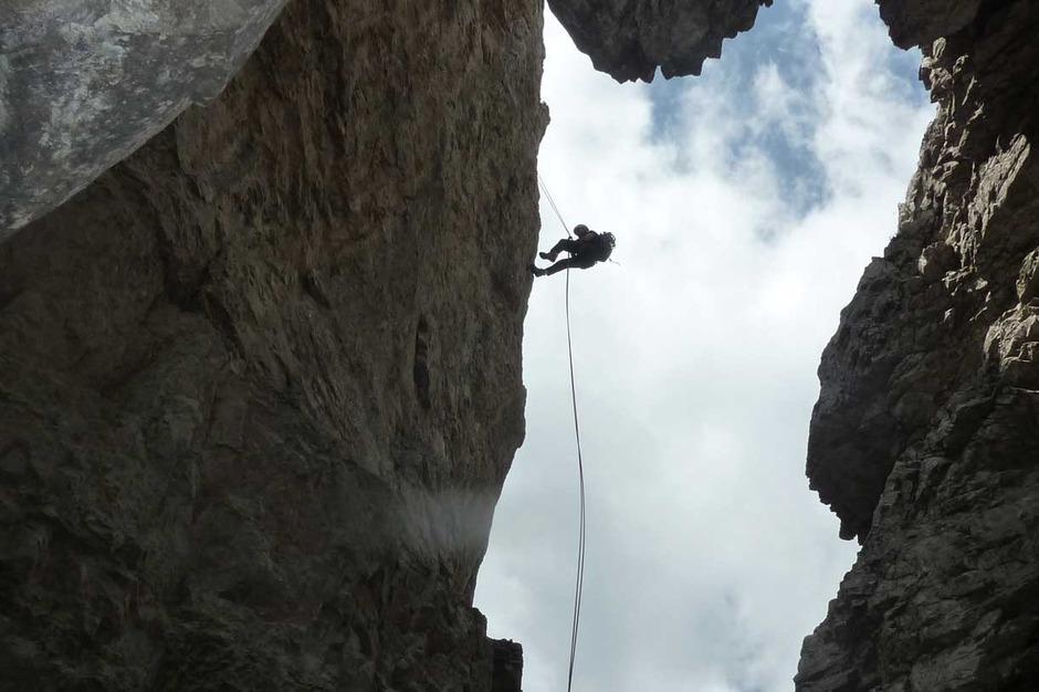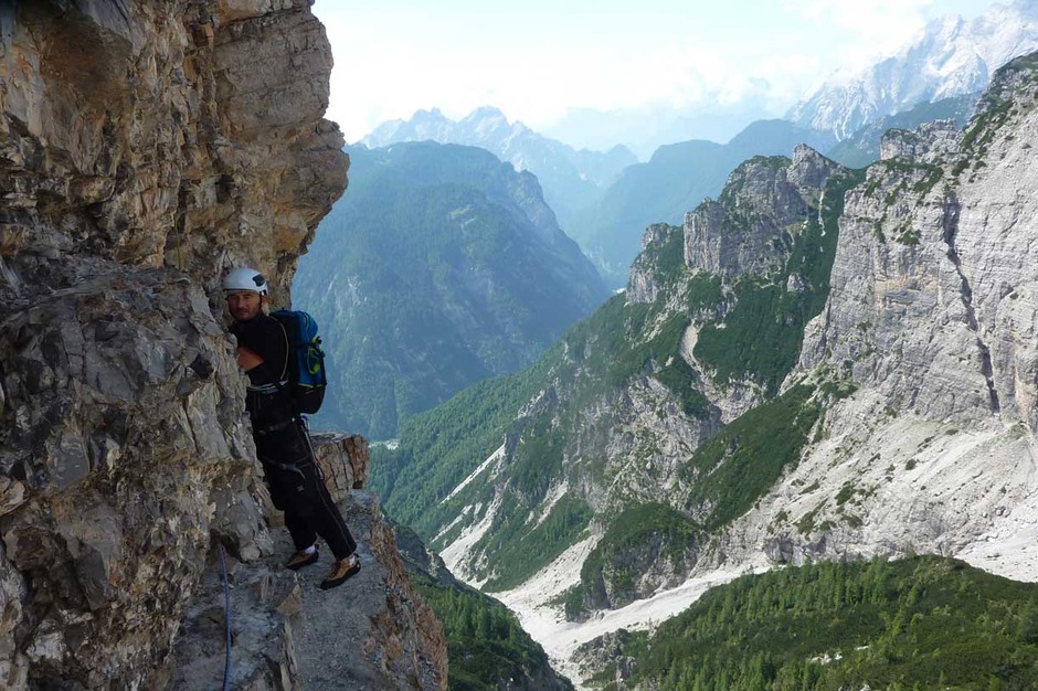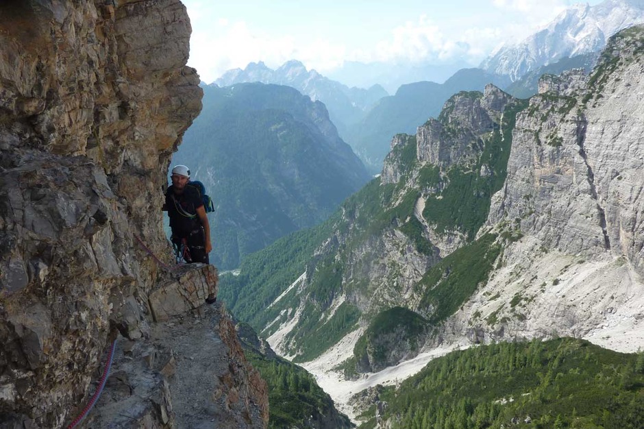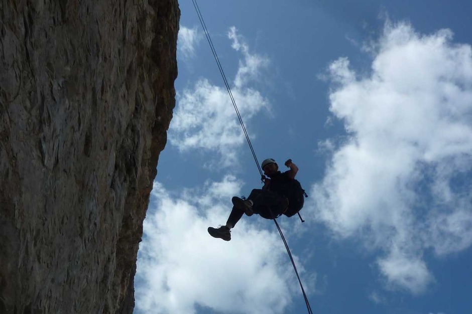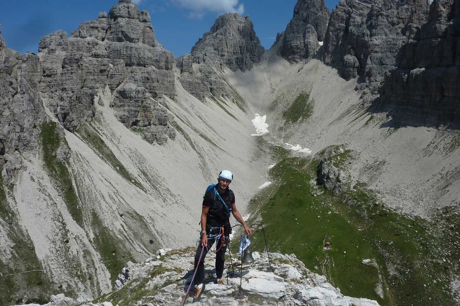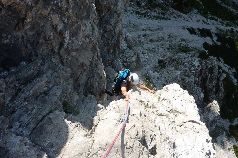 I climbed with Giorgio the historical route pioneered in 1902 by V. W Glanvell and K.G. von Saar. The ascending route is fascinating and challenging, with several grade 4 pitches on perfect rock. On the summit, instead of the usual cross, there is a metal bell.