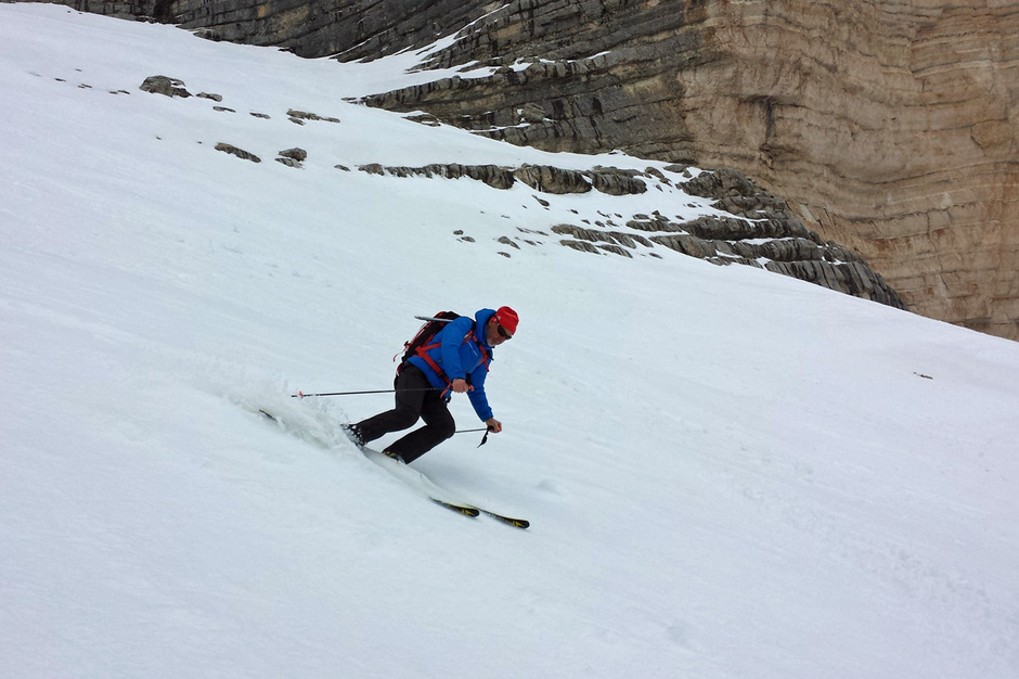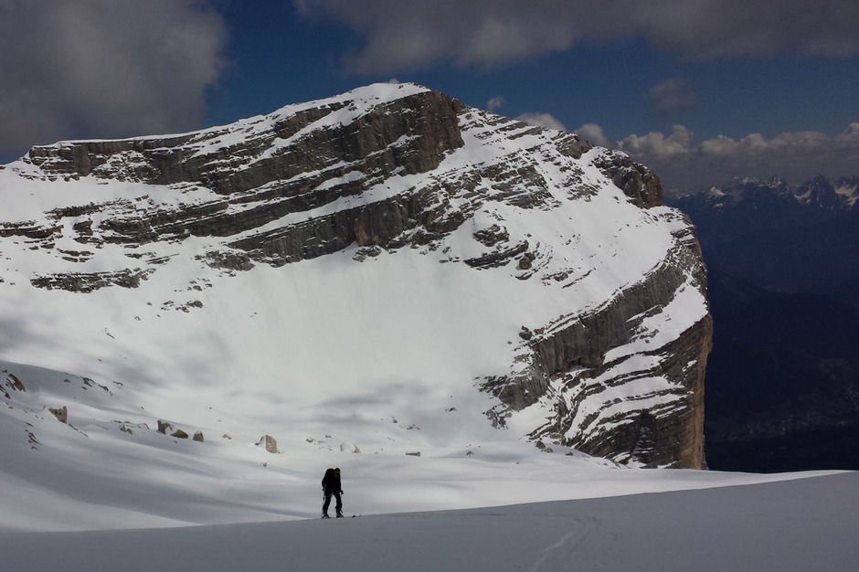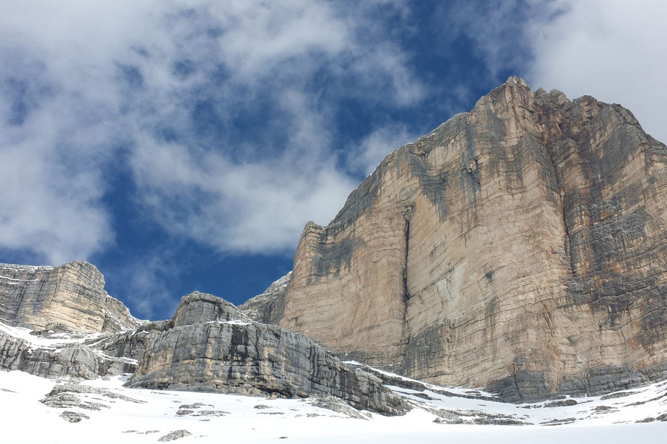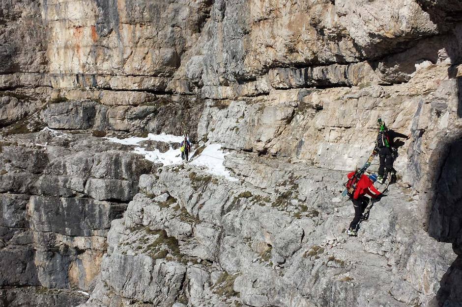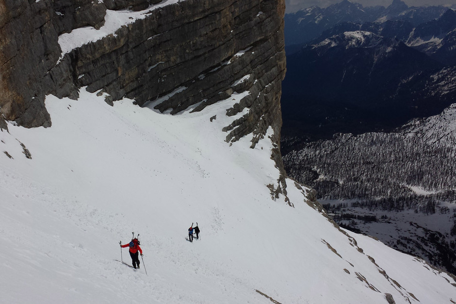 We left Ciauta Shelter at 5 a.m. and reached the Venezia Shelter; we then started climbing along the Pelmo Normal Route, first covering the long and exposed Ball Ledge, with the famous “cat crossing”, then climbing along the so called “caregon” (big chair), the splendid glacial circle of the Pelmo.