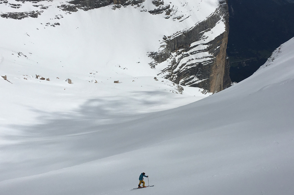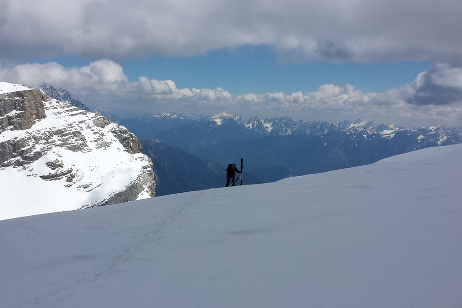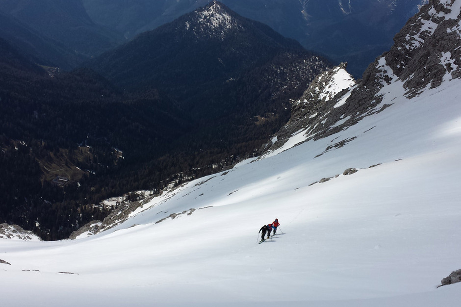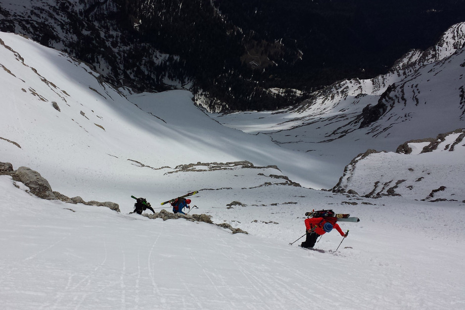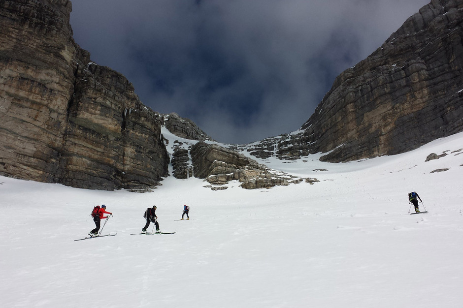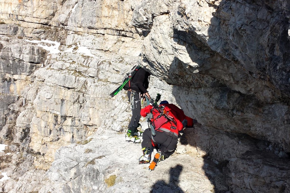 We left Ciauta Shelter at 5 a.m. and reached the Venezia Shelter; we then started climbing along the Pelmo Normal Route, first covering the long and exposed Ball Ledge, with the famous “cat crossing”, then climbing along the so called “caregon” (big chair), the splendid glacial circle of the Pelmo.
