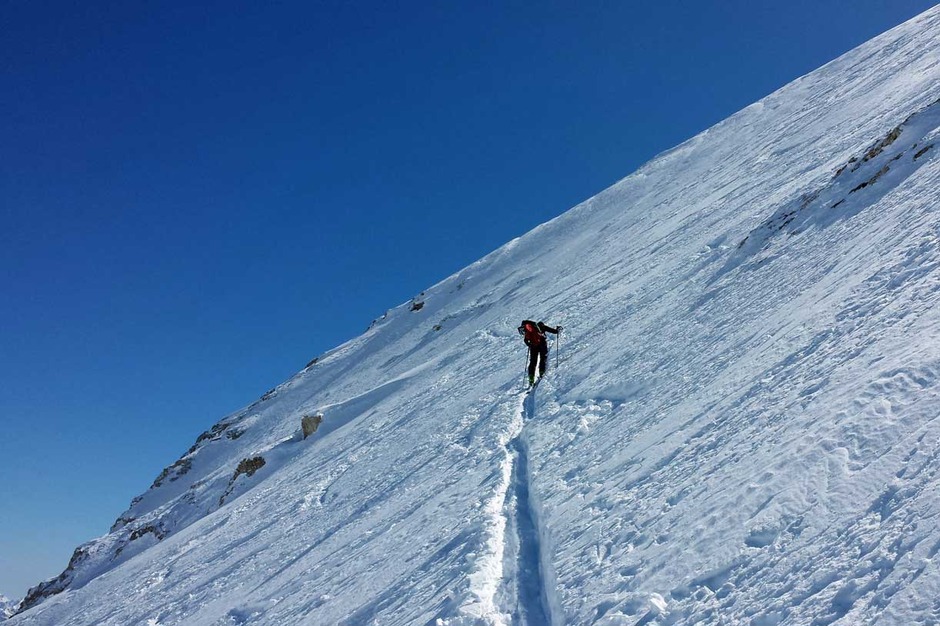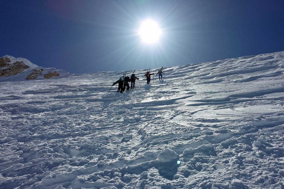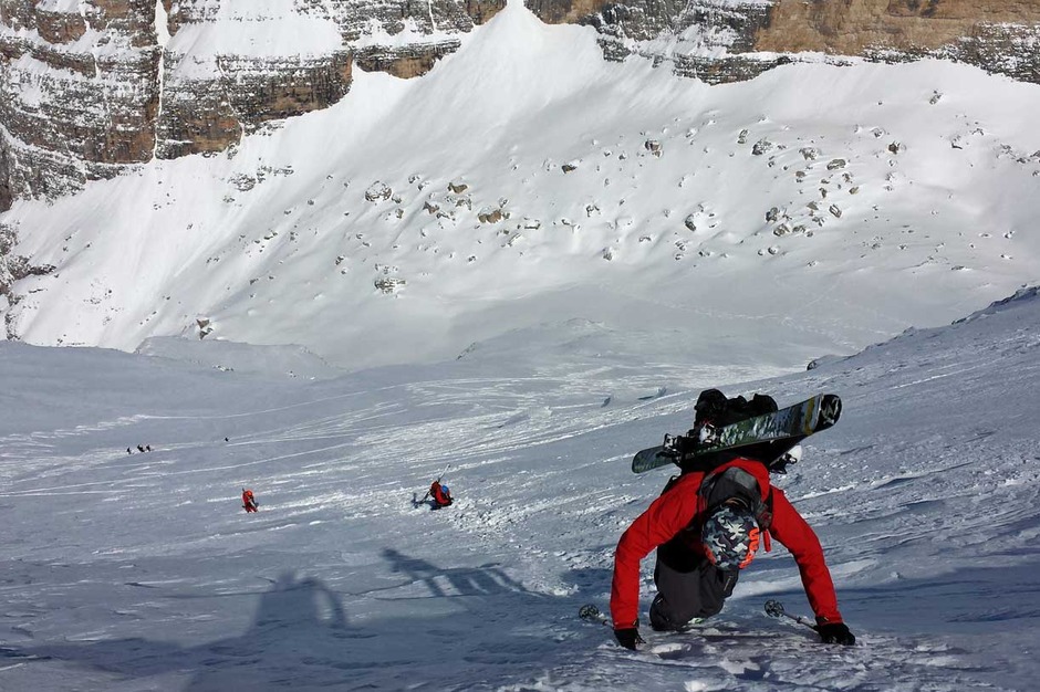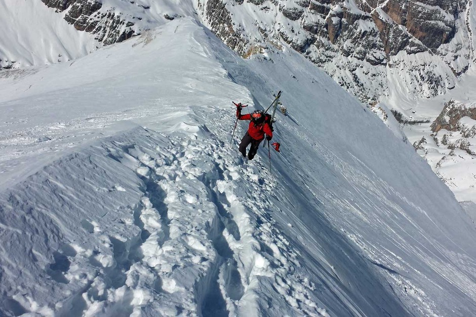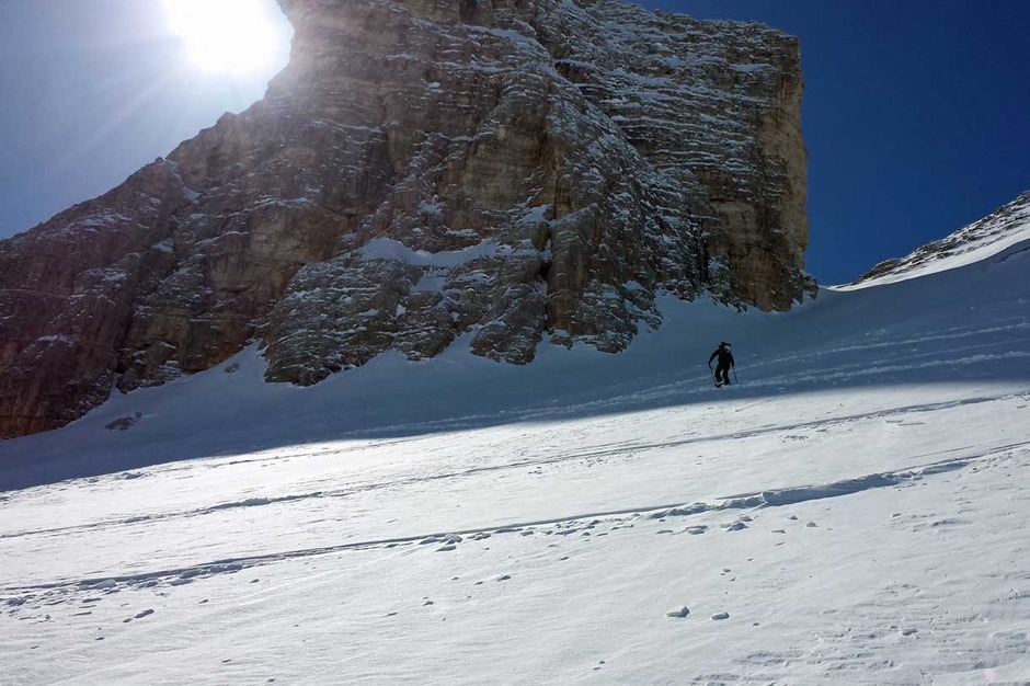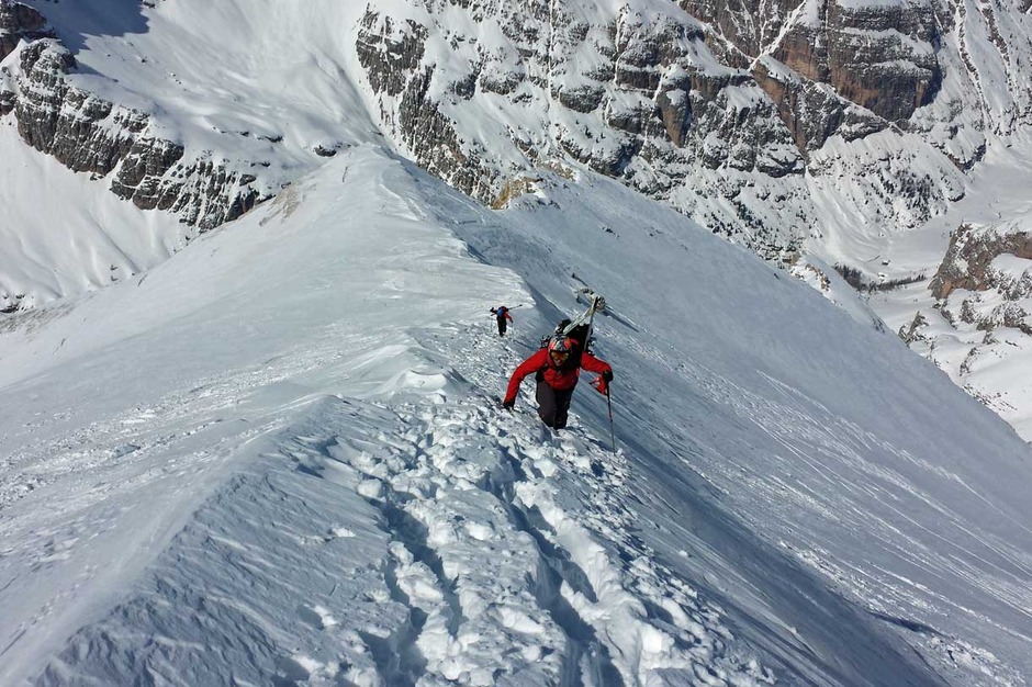 With a group of experienced mountaineers, we left Bus di Tofana to reach the old mountain hut Rifugio Cantore. From there, we climbed up towards the summit of Tofana di Rozes with our ski skins. Almost on top of the peak, we swapped the ski skins for the crampons and proceeded to reach the cross on the summit, where the amazing view of the Dolomites made up for the struggle of the ascent.