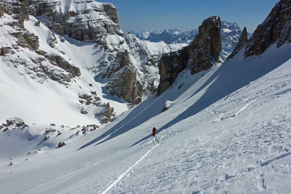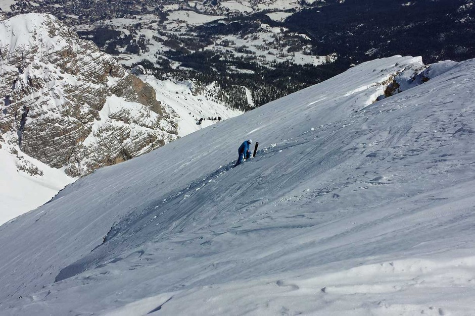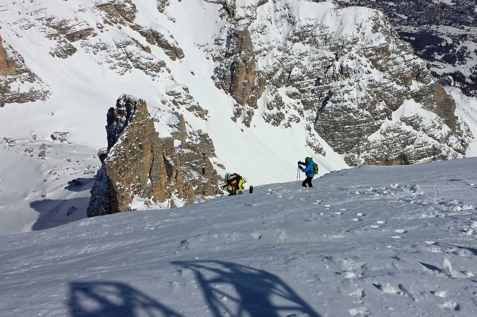 We used a rope as climbing protection to safely descend a vertical rock face, then we completed our descent skiing down the amazing gully on the East face of the peak, with the little town of Cortina on the background.