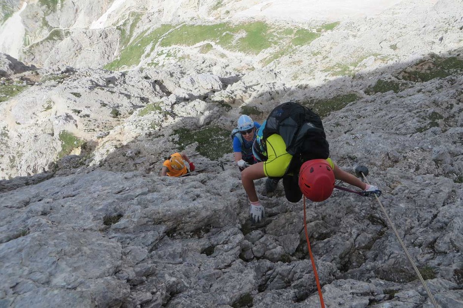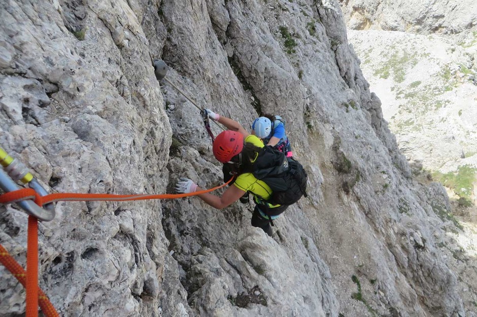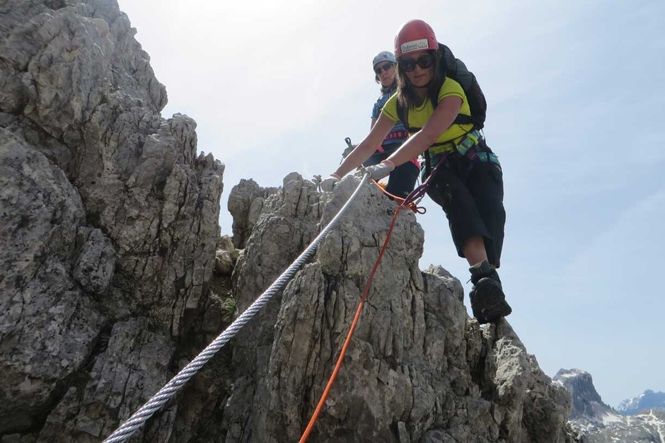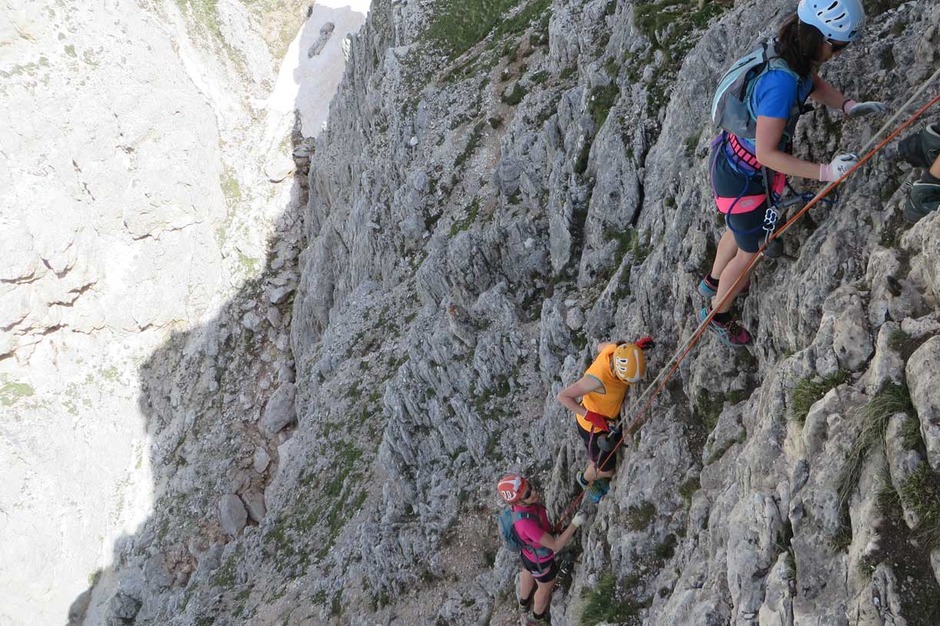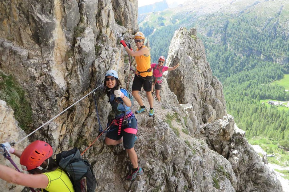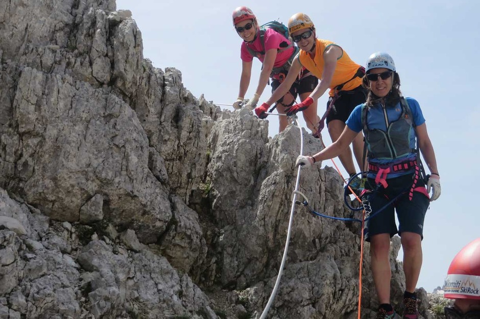 Contact usOn a beautiful day, we ascended with a nice group of ladies the South face of the Piramide del Col dei Bos, along the Via Ferrata degli Alpini.