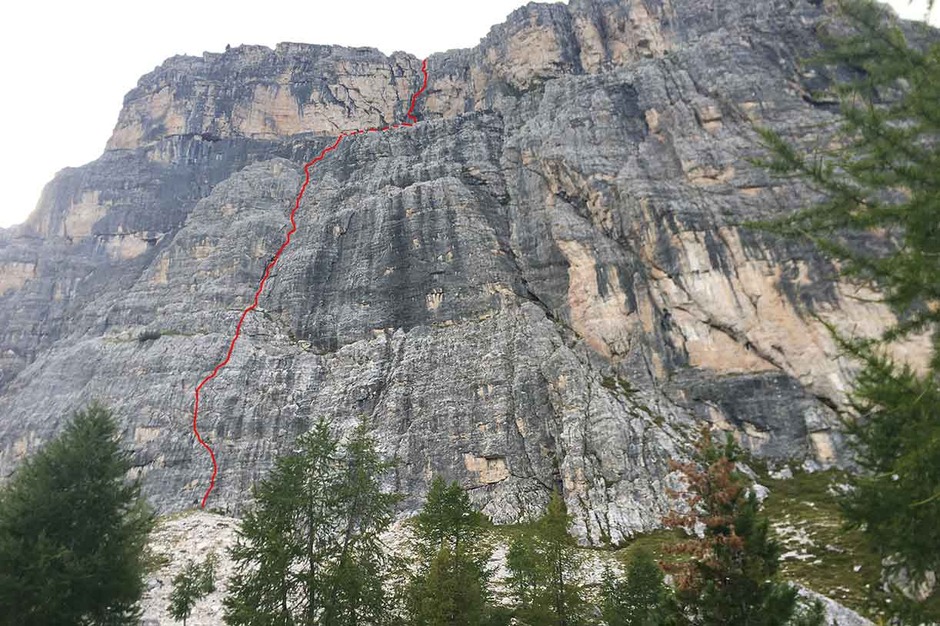 Si sale dritti fino ad un piccolo strapiombo (fix), per continuare poi, obliquando verso sinistra, fino alla sosta con catena.