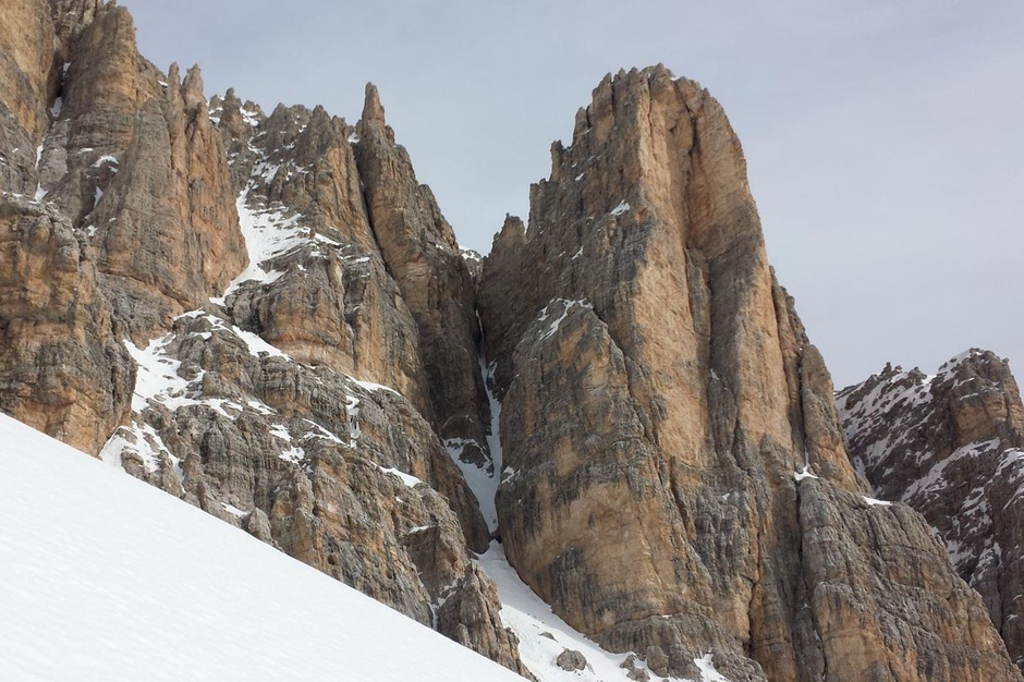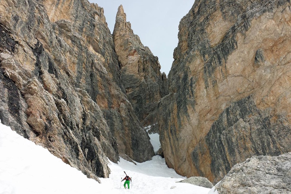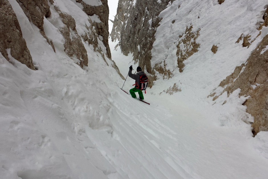 Il canale di discesa è bello dritto, tutto sciabile senza salti di roccia o grandi complicazioni. La difficoltà di discesa dipende dalle condizioni della neve, così come per tutti i canalini delle Dolomiti.