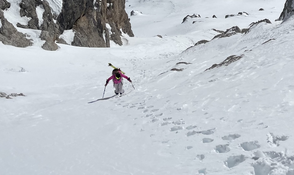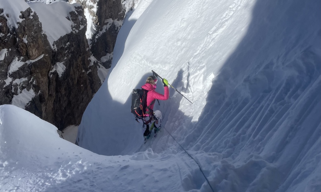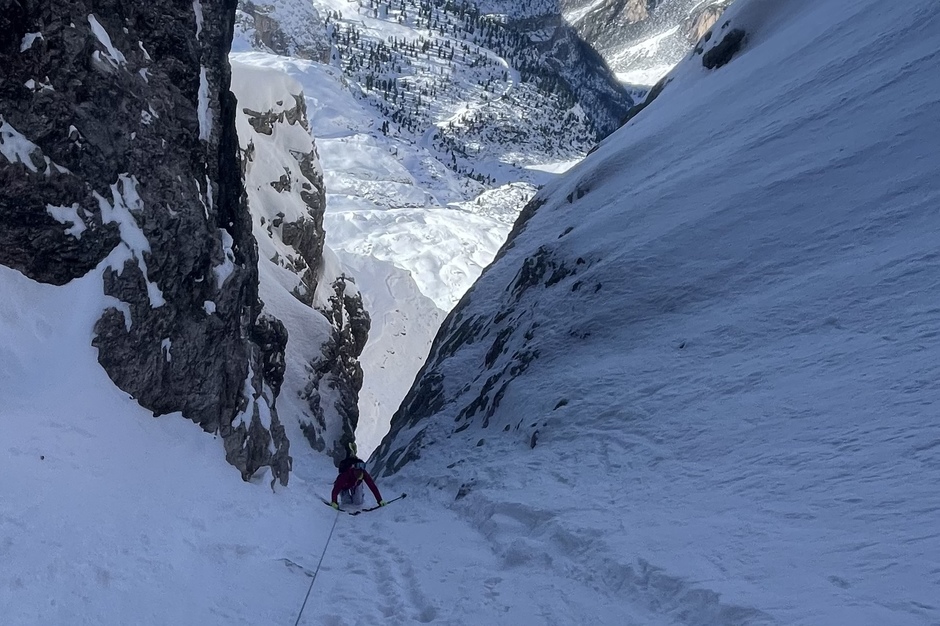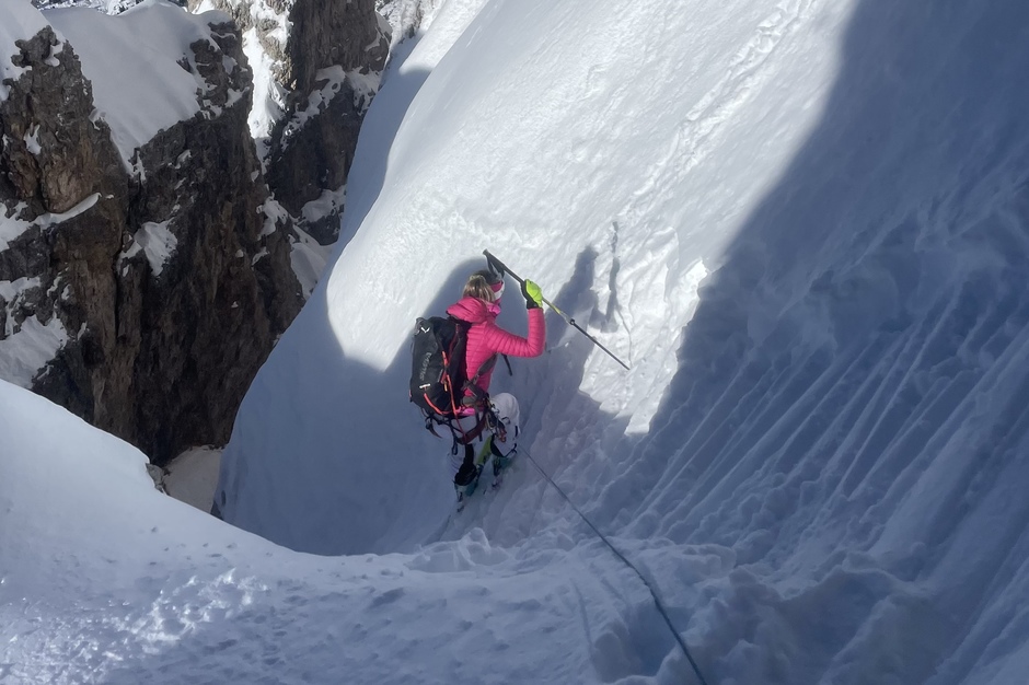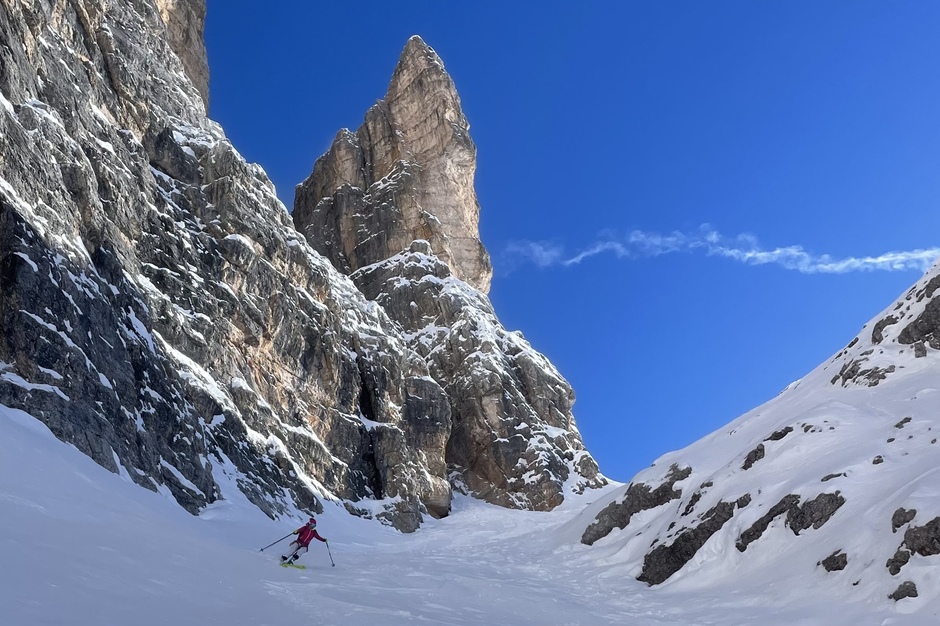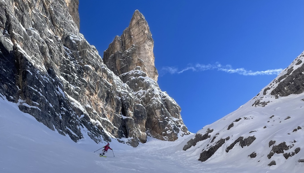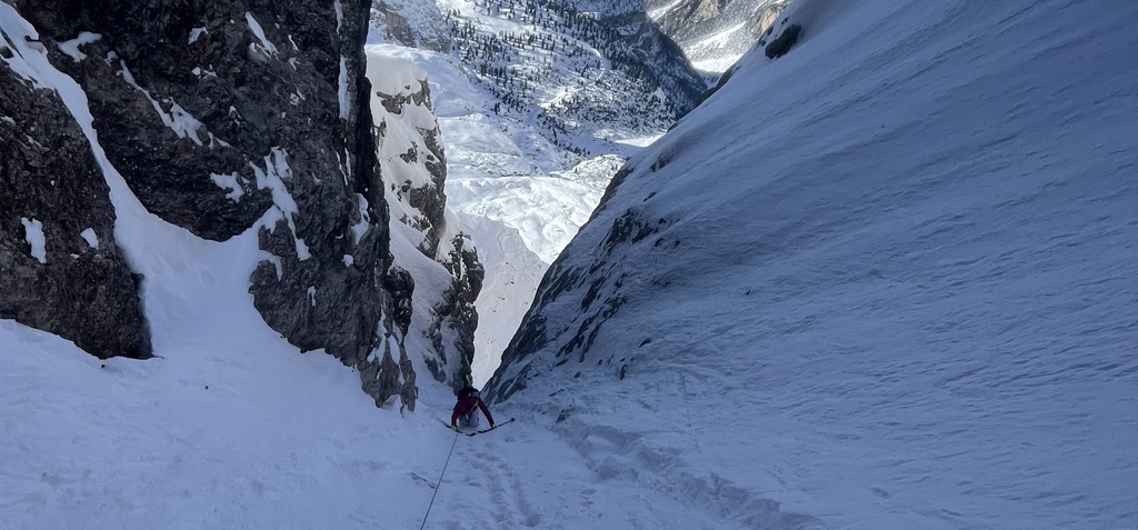 Si scende lungo la pista da sci fin sotto a dei vecchi paravalanghe, e con una lunga attraversata ( farla solo se il manto nevoso ve ben consolidato) si arriva sotto la forcella Gasser Depot. Messo le pelli si risale questa forcella e si prosegue fin sotto la parete sud della cima Fanis. Si risale un ripido canale fino ad arrivare ad una larga cengia che porta all’imbocco del canalino . L’entrata è abbastanza stretta e ripida per circa 20 metri , poi il canale si allarga e diventa ben sciabile . Una strettoia obbliga una calata a corda doppia di circa 25 metri assicurandosi su dei chiodi in ferro che si trovano sulla nostra desta scendendo. La seconda parte del canale invece diventa molto più facile e bellissimo da sciare . Arrivati al rifugio Scotoni ( birra media) si prosegue per pista battuta fino alla Capanna Alpina, e con un taxi si sale al parcheggio della funivia