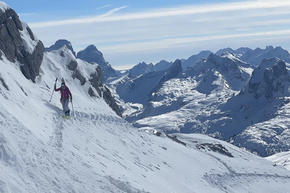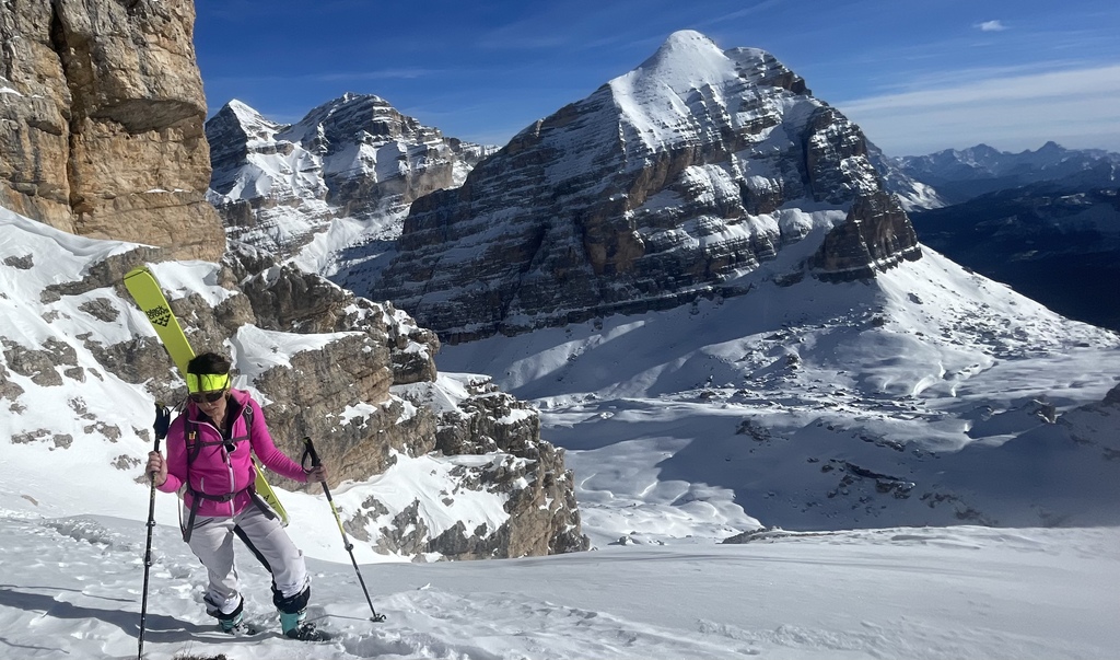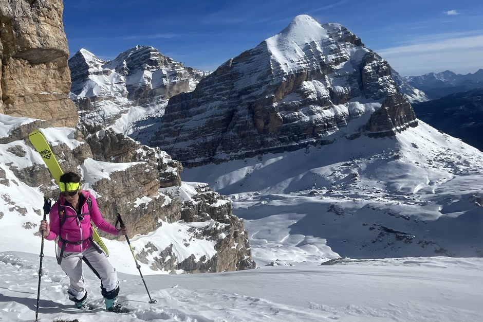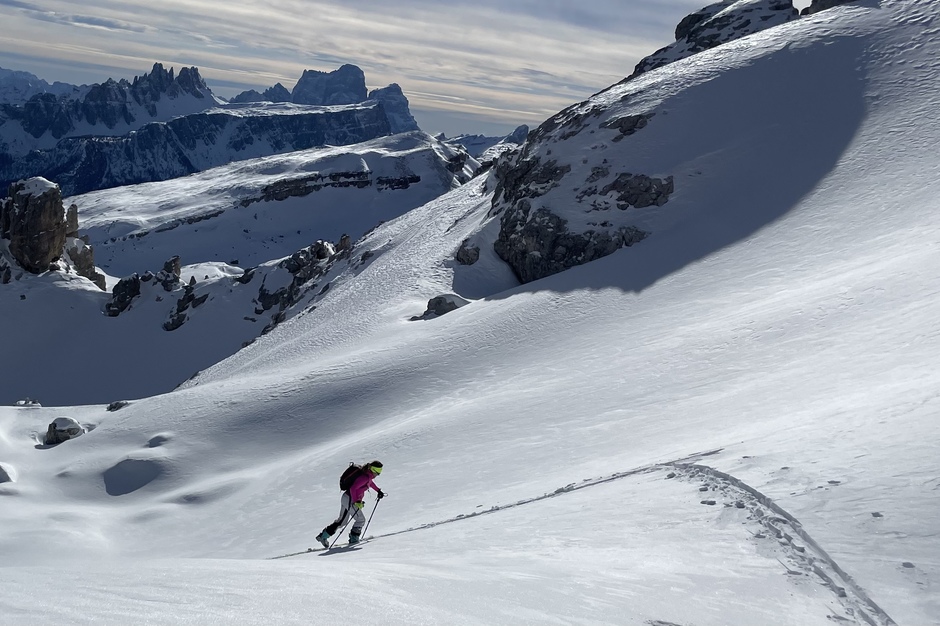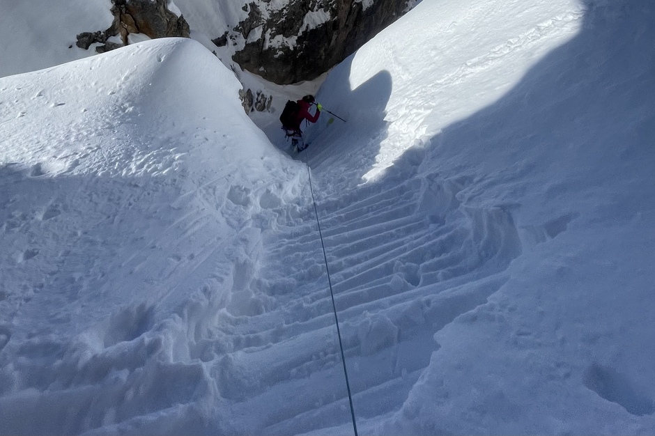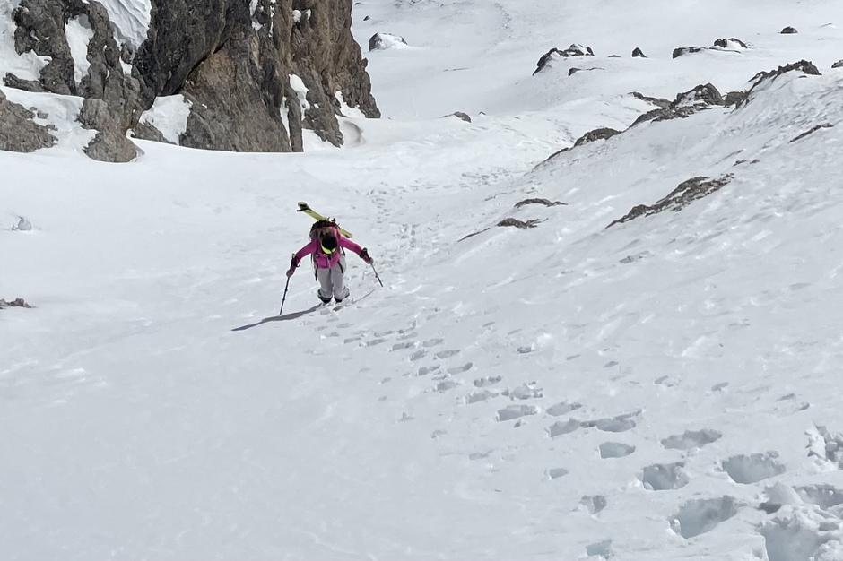 Si scende lungo la pista da sci fin sotto a dei vecchi paravalanghe, e con una lunga attraversata ( farla solo se il manto nevoso ve ben consolidato) si arriva sotto la forcella Gasser Depot. Messo le pelli si risale questa forcella e si prosegue fin sotto la parete sud della cima Fanis. Si risale un ripido canale fino ad arrivare ad una larga cengia che porta all’imbocco del canalino . L’entrata è abbastanza stretta e ripida per circa 20 metri , poi il canale si allarga e diventa ben sciabile . Una strettoia obbliga una calata a corda doppia di circa 25 metri assicurandosi su dei chiodi in ferro che si trovano sulla nostra desta scendendo. La seconda parte del canale invece diventa molto più facile e bellissimo da sciare . Arrivati al rifugio Scotoni ( birra media) si prosegue per pista battuta fino alla Capanna Alpina, e con un taxi si sale al parcheggio della funivia