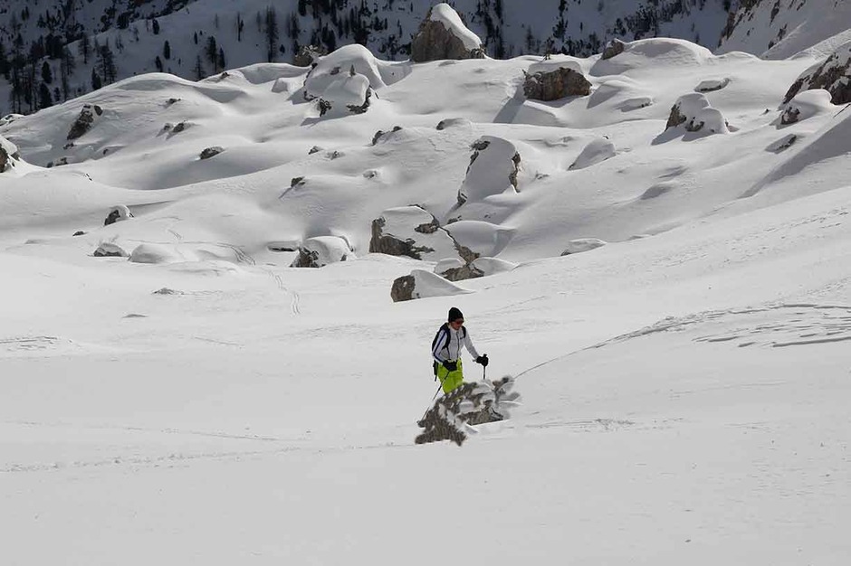 È possibile con neve assestata proseguire dritti e salire sia sulla destra che sulla sinistra della grande torre del Corno d’Angolo.